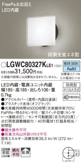 パナソニック エクステリア LEDポーチライト 防雨型 FreePaお出迎え 段調光省エネ型 明るさセンサー付 白熱電球40形1灯器具相当 電球色:LGWC80307KLE1 昼白色:LGWC80327KLE1