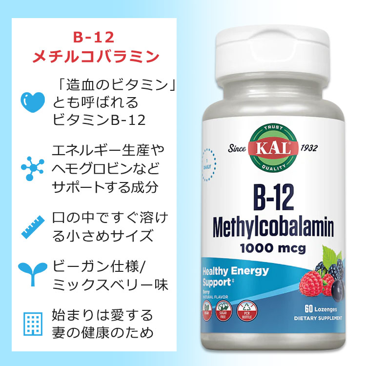 【最大1400円OFFクーポン】カル ビタミン B-12 メチルコバラミン 1000mcg 60粒 トローチ ミックスベリーフレーバー KAL B-12 Methylcobalamin berry 60 Lozenges サプリ ヘルスケア ビタミンB ビタミン ロズンジ チュアブル