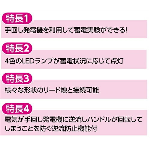 [商品名]ARTEC コンデンサー蓄電実験器 インジケータ付 ATC9730代引き不可商品です。代金引換以外のお支払方法をお選びくださいませ。4色のLEDランプで蓄電状況がわかりやすい!4色のLEDランプで蓄電状況がわかりやすい!●手回し発電機を利用して蓄電実験ができる!●4色のLEDランプが蓄電状況に応じて点灯●様々な形状のリード線と接続可能●電気が手回し発電機に逆流しハンドルが回転してしまうことを防ぐ逆流防止機能付※定格:2.5V、静電容量:3.3Fサイズ:約84×37×60mm重量:85g材質:アクリル生産国:中国※入荷状況により、発送日が遅れる場合がございます。電池3本おまけつき(商品とは関係ありません)