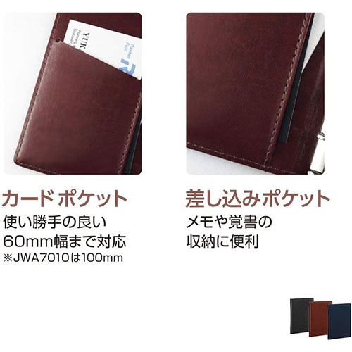 ビジネスのスケジュール管理やライフログノートに最適。中身の入れ替えができるリング式システム手帳。手馴染みの良い上質な合皮を使用。【スリムタイプ】リング径15mmのスリムタイプ。薄い仕様なので携帯時に便利。リフィル収納枚数は約105枚、厚さ9mmとなります。※一般的に使用されるコピー紙を目安としています。【カードポケット付き】使い勝手の良い内側カードポケット付き。100mm幅まで対応しています。【差し込みポケット付き】とっさのメモや覚書の収納に便利です。【固定式ペンホルダー付き】幅14mm径のペンまで対応しています。【リフィル内容】表紙+Personal profile 1枚。フリーマンスリースケジュール(ブロックタイプ) 20枚。6.5mm横罫ノート 30枚。チェックリスト 5枚・材質 : 合皮(ポリウレタン)・リング : 内径15mm・固定式ペンホルダー(14mm径まで)・生産国 : 中国豆乳(入浴用化粧品)5個おまけつき(商品とは関係ありません)別送