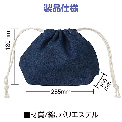 おしゃれで実用的!毎日のランチやお出かけに活躍する巾着!丈夫で軽量なデニム素材を使った巾着袋です。お弁当箱がすっぽり入るマチ付き設計で、出し入れがスムーズに行えます。学校生活はもちろん、アウトドアや習い事にもおすすめです。・商品サイズ : 255×180mm×マチ100mm・セット内容 : 本体のみ・重量 : 54g・材質 : ポリエステル(70%)、綿(30%)・梱包形態 : 袋入り・生産国 : 中国・保証期間 : 初期不良対応※洗濯後は速やかに形を整えて陰干しをしてください。※汗や雨等で湿った状態、または摩擦によって、他の物に色移りする場合がございますのでご注意ください。※色落ちする場合がございますので、他の物(特に白、淡色)とのお洗濯はお避けください。※製品一点に対する説明・仕様になります。(H)おまけつき(商品とは関係ありません)別送