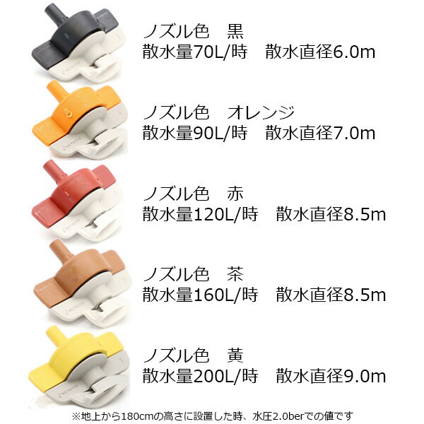 ・ネタフィムのマイクロスプリンクラー用スピンネットノズルです。 ・グレースウィベル付き(水平軌道)。 ・水流を妨げるブリッジが無いので、全面散水が可能・ボタ落ちもありません。 ・水平起動の散水で、均一性に優れています。 ・酸に対する耐性(耐酸性)があります。 ※色ごとに仕様が異なります。散水量、散水直径を参照の上お選びください。 ・入り数:10個入り ・ノズル色:黒、オレンジ、赤、茶、黄(★お選びください) 【黒】散水量70L/時、散水直径6.0m 【オレンジ】散水量90L/時、散水直径7.0m 【赤】散水量120L/時、散水直径8.5m 【茶】散水量160L/時、散水直径8.5m 【黄】散水量200L/時、散水直径9.0m ・水圧範囲(共通):2.0~3.0ber ※地上から180cmの高さに設置した時、水圧2.0berでの値です。
