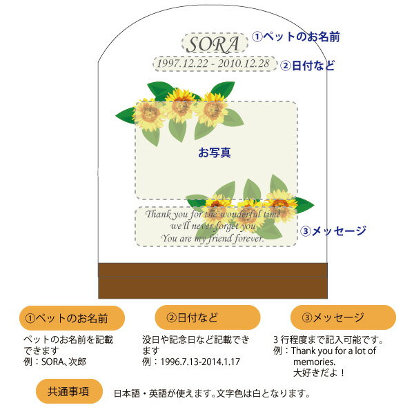 写真の送信はご注文後にお願いします。 受注番号が必須となります。 高級ガラス製のペット位牌です。 ペットの生前のお写真を直接印刷いたします。 お名前やメッセージを入れて世界にひとつだけの素敵なモニュメントが出来あがります。[仏壇仏具、御仏前、記念品] ★こちらの商品は他の商品と同梱できません 【お申し込みは簡単!】 買い物かごでご購入していただき、進んでいくとSTEP3の一番下に備考欄がありますのでそちらにご記入ください。後からメールで送っていただいてもかまいません 土日祝日は確認メールが届かないため御注文後、sk@starkids.co.jpのメールに上記内容を記載いただいて事前に送っていただいても構いません。(必ずお名前とお電話番号はお知らせ下さい) ■製作期間は約10日間です(発送期間は2日) ■サイズ・材質 サイズ:高さ190mm×幅160mm ガラス製(台は木製) 加工方法:UVカラー印刷 ■ 【製作手順】 (1)買い物カゴ中の備考欄にペットの名前、記念日・メッセージをご記入下さい。ご注文完了後、写真画像をアップロードボタンから送ってください。 プリント写真の場合は郵送でもかまいません。 メッセージ記載例 1.ペットの名前:Shiro (漢字やひらがなでもOKです。記載内容がそのまま原稿になります) 2.日にち(生誕・没日): 2000.8.25〜2014.8.10 3.メッセージは選択して頂くかご希望の内容があれば備考欄にお書き下さい。 またサンプルメッセージの組み合わせもOKです。 【2】と【7】を2段で・・など (2)写真が届いたらレイアウトします。 (3)約2日後、イメージ画像が完成します。メール添付しますので確認をお願いします。 (4)問題がなければ製作開始。約10日ほどで完成 (5)商品発送 ラッピング無料高級ガラス製のペット位牌です。 ペットの生前のお写真を直接印刷いたします。 お名前やメッセージを入れて世界にひとつだけの素敵なモニュメントが出来あがります。 大切な家族。愛するペットの思い出写真を記念に残したい。 そんな皆様のお声からデザインを作りました。 思い出の写真で作るペットのメモリアルグッズ。 フォトフレームメッセージの例文です。例文をご利用ください。ご自分のオリジナルメッセージを希望される場合は備考欄にご記入をお願いします。 メモリアルメッセージ例文 【1】 Thank you for a lot of memories. (たくさんの思い出をありがとう) 【2】 Thank you for a lot of love. (たくさんの愛をありがとう) 【3】 You were so Special to me. (あなたは私にとって大切な存在でした。) 【4】 Eternally in my heart. (私の心の中で永遠に) 【5】 Thank you for the love & the joy you bring. (愛と喜びをもたらしてくれてありがとう) 【6】 It's connected even if we leave it. (離れていても繋がっているよ) 【7】 My love to you will never change forever. (あなたへの愛情は永遠に変わらない) 【8】 I'm so happy to have gotten to know you. (あなたにめぐり逢えてよかった) 【9】 Thank you for being a wonderful friend. (すばらしい友人でいてくれてありがとう) 【10】 その他、オリジナル文章(備考欄にご記入ください)