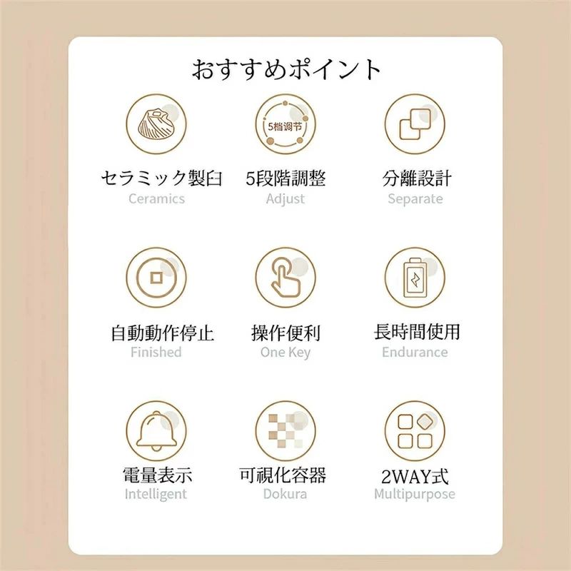 "商品情報 素材 商品名:2WAYコーヒーミル 素材:ABS、ステンレス、セラミック サイズ:約直径73×210mm 電池容量:1600mAh 充電時間:約1~2時間 容量:150ml 電源:5V/1A 重量:479g 特徴 【一台多役、様々な場所に活躍&コンパクト】 コーヒーミルはコーヒー豆に限らず、お茶、豆類、お米、八角、唐辛子、胡椒、山椒、香辛料、煮干し、薬膳など様々な食材を挽けます。 おしゃれなデザインに高い機能性、コーヒー好きの方や料理好きな方への素敵なプレゼントです。 電源不要のコードレスで、活躍の場を選ばずおいしいコーヒーを楽しむことが出来ます。 【自動停止機能搭載】 コーヒー豆を挽き終わったら自動的に電源をOFF。 消し忘れを防止しつつ、ながら作業もできるため忙しい朝などにぴったりです。 電動ミルに過負荷防止装置も搭載しており、長く使えるように強制的に休ませる仕組みにしています。とても安心です。 注意事項 こちらの商品は実店舗でも販売しております関係上、ご購入のタイミングによっては品切れが発生する場合もございます。 大変恐れ入りますが、その場合はキャンセル対応をさせていただきますこと、予めご了承ください。"