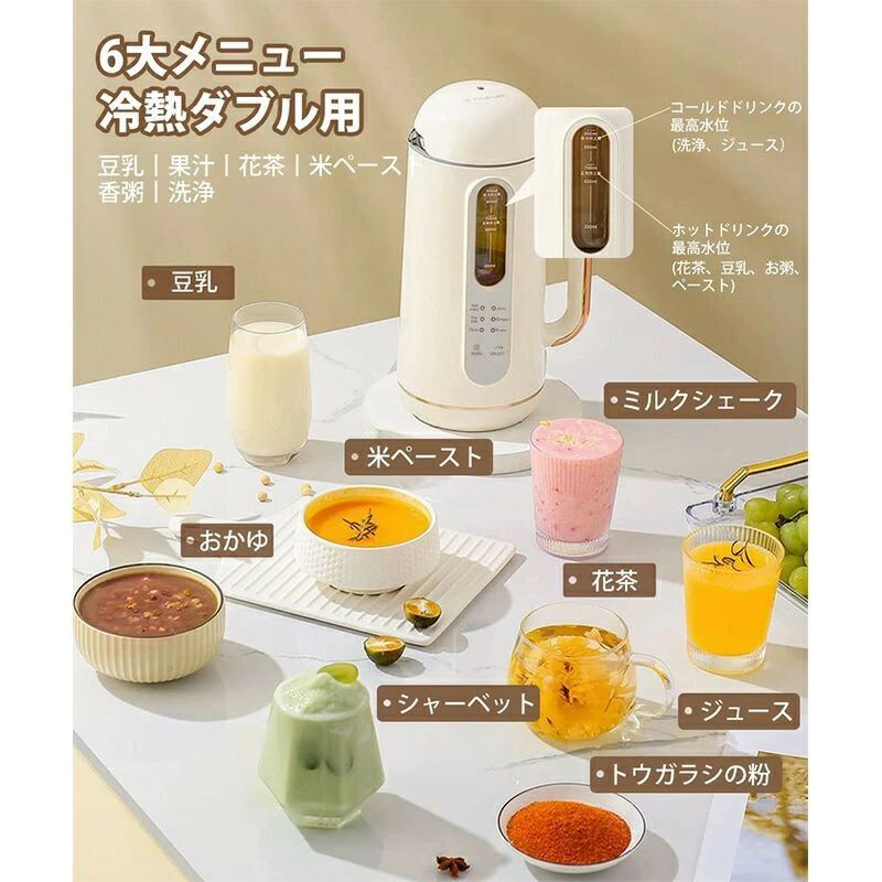 一台多役:豆乳だけではなく、花茶ジュースお粥米ペーストなども作れます。赤ちゃんの離乳食などの様々な食材を素早く粉砕し、豊富なお料理に活用できます。家族が好きなものをこの1台で作れます乾燥豆でもOK高品質なモーター:大豆を水で浸けず、ワンタッチだけで操作でき、あったか豆乳、コーンジュース、セロリジュースなど。フードレベルステンレス製丈夫な刃ブレード4枚を採用し、優れい400W(加熱)と250W(ミックス)のパワーモーターを搭載します。レードは最高27200次/分で高速回転です。誰でも手軽に毎日使いたくなり、初心者もぴったりです大容量タイプ:出来立ての豆乳で良質なタンパク質と食物繊維を摂取でき、新鮮な大豆や野菜など具材に熱を加えて攪拌まで全自動で調理してくれるので、約25分で本格的な豆乳、ポタージュが作れます。容量は700ml(温かい飲み物)900ml(冷たい飲み物)で一度に軽めの1〜3人分は作れますらくらく洗浄機能:使用後は水と台所用中性洗剤を数滴入れ、洗浄モードで簡単にお手入れOK。パワフルに高速回転し、刃の周りの汚れを落とします。一台多役:豆乳だけではなく、花茶ジュースお粥米ペーストなども作れます。赤ちゃんの離乳食などの様々な食材を素早く粉砕し、豊富なお料理に活用できます。家族が好きなものをこの1台で作れます乾燥豆でもOK高品質なモーター:大豆を水で浸けず、ワンタッチだけで操作でき、あったか豆乳、コーンジュース、セロリジュースなど。フードレベルステンレス製丈夫な刃ブレード4枚を採用し、優れい400W(加熱)と250W(ミックス)のパワーモーターを搭載します。レードは最高27200次/分で高速回転です。誰でも手軽に毎日使いたくなり、初心者もぴったりです大容量タイプ:出来立ての豆乳で良質なタンパク質と食物繊維を摂取でき、新鮮な大豆や野菜など具材に熱を加えて攪拌まで全自動で調理してくれるので、約25分で本格的な豆乳、ポタージュが作れます。容量は700ml(温かい飲み物)900ml(冷たい飲み物)で一度に軽めの1〜3人分は作れますらくらく洗浄機能:使用後は水と台所用中性洗剤を数滴入れ、洗浄モードで簡単にお手入れOK。パワフルに高速回転し、刃の周りの汚れを落とします。