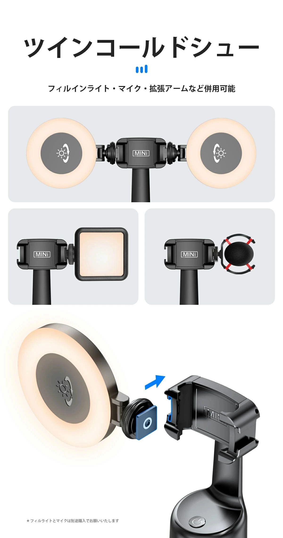 特徴【顔認識で360°自動追跡可能】 科大訊飛のAIチップを採用し、スマホ ジンバルはきちんと顔に反応して動いてきます,しっかり追いかけています。動きに機敏に対応して、動画を撮るとき動くものを撮るときなどは、自動で動くのでとても便利です。はじめて自動追跡機能を使いたいという初心者に最適、ひとりでも動画や写真を撮ることができます。 【三脚を組み合わせて】 自動追跡スマホスタンドは机の上に置くもよし、底部にネジがあるので三脚や自撮り棒にも使えます。自撮り棒を伸ばして組み合わせます。ダンス/旅行/Vlog/自動追尾入門者に最適。色々に活用可能です。 【多方向回転、スタンド取り外し可能】 スマホホルダー360°水平回転可能、180°垂直反転可能。料理/メイク/YouTube/ダンス/旅行/Vlog/任意(360°)(180°)の調節が可能です。急な用事があればスタンドごと取り外すこともできるので、日常生活にも便利です。 ツインコールドシューにより、フィルインライトもマイクも併用可能 ご注意: 1/4インチナットマウントにより、三脚と併用可能(三脚は別途購入でお願いいたします)詳細製品寸法:175.2×54.8×62mm(マウント無し) 183.7×95×95mm(マウント 有り) マウント寸法:95×95×8.5mm(マウントサイズ) 色:黒、白、桃(black,white,pink) 梱包寸法:204×101×68mm 重さ:225g