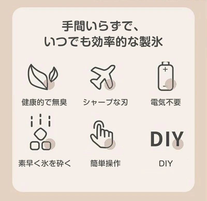 商品仕様商品名かき氷機 手動式 かきごおり機 かき氷器 バラ氷/冷凍フルーツに適用 味付き氷 ジュース ミルク氷 冷凍フルーツ 水洗える 家庭用 アウトドア 操作簡単 DIY 夏 子供 プレゼント商品紹介【夏に最適】暑い夏には、氷にシロップ、コンデンスミルク、ミルクを加えて、さまざまな味のかき氷を作ることができます! かき氷、スムージー、刺身、魚介類の保存に最適です。【ステンレス製両刃】本機は厚みのあるステンレス製の刃を採用しており、錆びなくて耐久性があり、雪の結晶のようにふわふわしたきめの細かい氷を作ることができます。【食品グレードの素材】かき氷機は食品グレードのPP素材を採用しており、体に害を及ぼす心配はありません。 氷削り機を購入すると、追加の冷凍庫型が付属します。【ポータブルで実用的】拡張手動ロッカーは使いやすく、労力を節約できます。 電気がなくても、いつでもどこでも涼しさを楽しめます。【幅広い用途】ご家庭でのスムージー作りだけでなく、夏祭り、スーパー、飲食店、かき氷店などでも活躍します! メーカー希望小売価格はメーカー商品タグに基づいて掲載しています。
