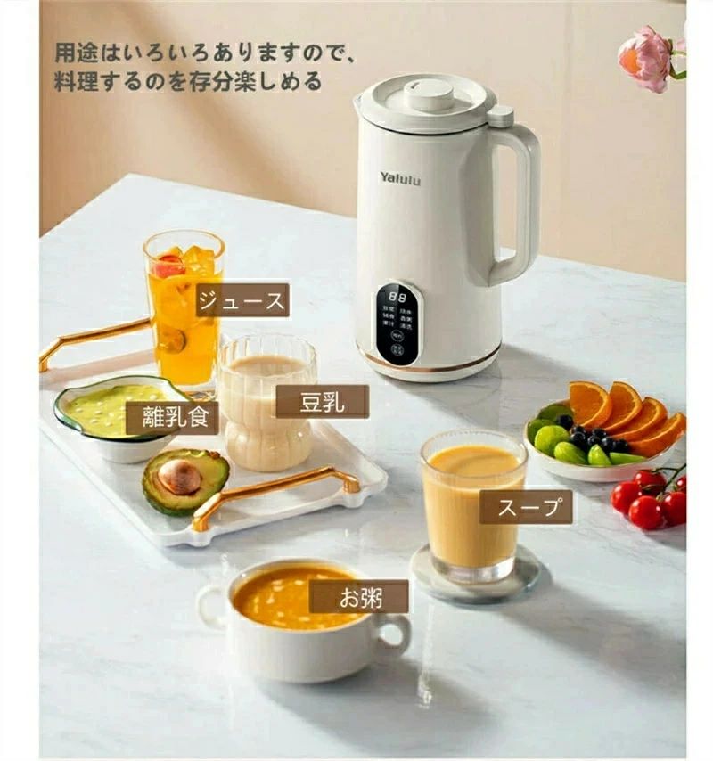 商品情報:御注意:※説明書はPDF版となります。商品出荷後に必要のお客様はご連絡ください。※沖縄、北海道への発送致しませんので、誤ってご注文頂く場合は、ご注文をキャンセルさせて頂きます。商品名:YALULU自動調理ポットサイズ:約 250mmx130mmx160mm重量:約 1.1kg材質:ポリプロピレン、ステンレス 等仕様:電源電圧:AC100V 50/60Hz定格消費電力:加熱機能500W、攪拌機能120W定格容量:800ml回転数(無負荷時):約 13500回転/分生産国:中国製豆乳、ペースト、お粥、お湯、ジュース、洗浄。ボタンを押すだけで加熱調理から粉砕まで全自動で行う加熱式ブレンダーです。いわば、電気ケトルとフードプロセッサーを合わせた一台!食材を丸ごと、沸騰させずに調理するので、大豆そのままの栄養を含んだ豆乳をご自宅で楽しめます。ポタージュや離乳食はもちろん、非加熱モードでフレッシュジュースも!【800ml大容量】女性でも楽々持ち運べる軽さと、コンパクトなサイズ感と、そのまま注ぎやすい形状。一度におよそコップ2〜3杯分の量(350-650ml)を作る事ができます。一台だけで、自宅、オフィスなど様々な場所に適用出来ます【高品質なモーター】フードレベルステンレス製丈夫な刃ブレード10枚を採用し、優れい500W(加熱)と120W(ミックス)のパワーモーターを搭載します。【お手入れ簡単】この加熱式ブレンダーの場合、刃を取らずそのまま自動洗浄してくれます洗浄モードを押して放置し、水で濯ぎ洗いをするだけでお手入れ完了。 忙しい朝にも楽々管理できるので健康習慣をしっか。り続けられます。最短20分で、豆乳が作られます。メーカー希望小売価格はメーカーカタログに基づいて掲載しています