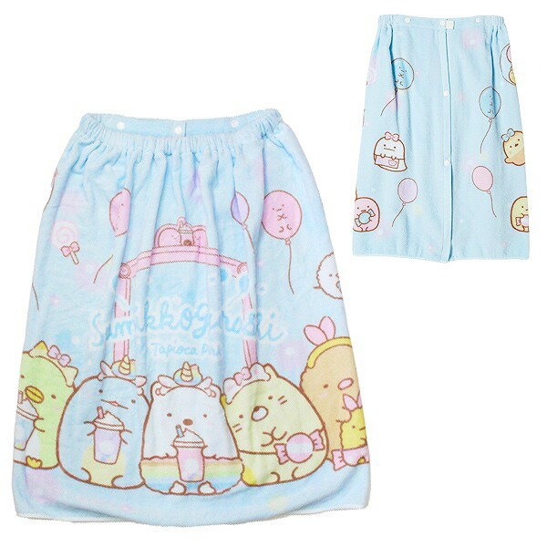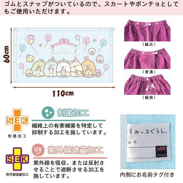 すみっコ ぐらし 巻きタオル 60cm ラップタオル スナップボタン すみっこ キッズ 子供 園児 小学校 低学年 海 プールかわいいすみっコの巻きタオル!●商品説明:こちらは海やプールのレジャー、お風呂上がりに大活躍の巻きタオル!ゴムとスナップが付いているのでスカートやポンチョのように使用できます。スナップボタンの位置をつけかえて、3段階にサイズ調整が可能。吸水速乾でやさしい肌触り。内側には名前が書けるネームタグ付き。●カラー:すみっコぐらし●サイズ:ワンサイズ60×110cm●素材:綿100%