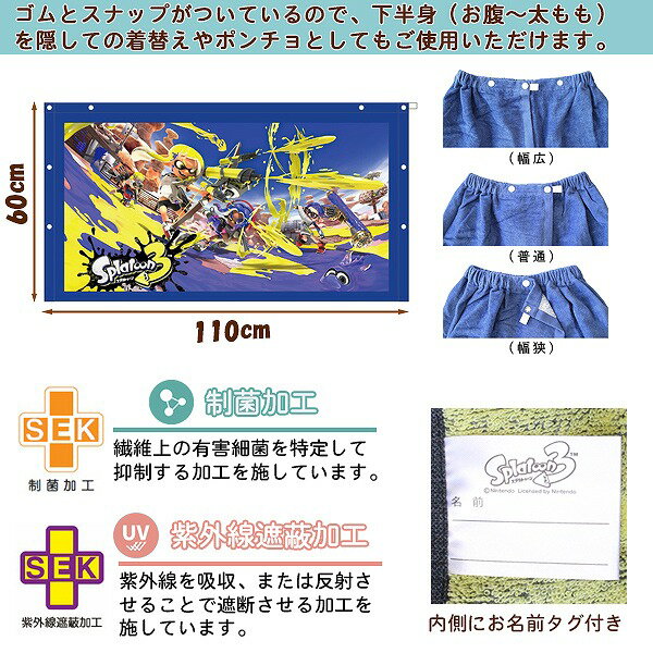 スプラ トゥーン 3 巻きタオル 60cm ラップタオル スナップボタン 幼児 小学生 低学年 男 子供 海 プール 水遊び 水泳プラトゥーン3のかっこいい巻きタオル!●商品説明:とってもかっこいいデザインの60cm丈マキタオルです。ゴムとスナップが付いているのでスカートやポンチョのようにして使用できます。お風呂上りや水泳の後などのお着替えにさっと巻けて便利です♪吸水速乾・・・水分を素早く吸収!吸水速乾素材を採用。制菌加工・・・繊維上の有害細菌を特定して制御する加工。紫外線遮蔽・・・繊維製品に紫外線遮蔽効果(遮蔽率90%以上)●カラー:スプラトゥーン3●サイズ:ワンサイズ約60×110cm●素材:綿100%