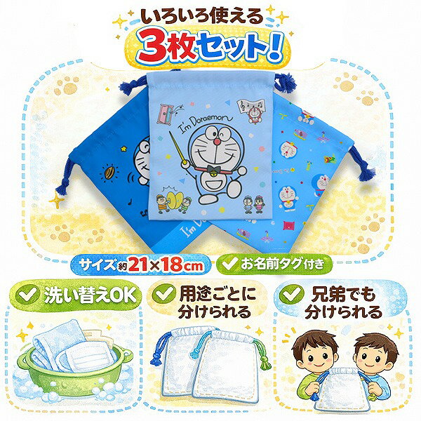 ドラえもん I'm Doraemon 巾着 3枚 セット 21×18cm 男の子 コップ 入れ 歯ブラシ マスク ポーチ 入園 入学 新学期 登園 メール便送料無料