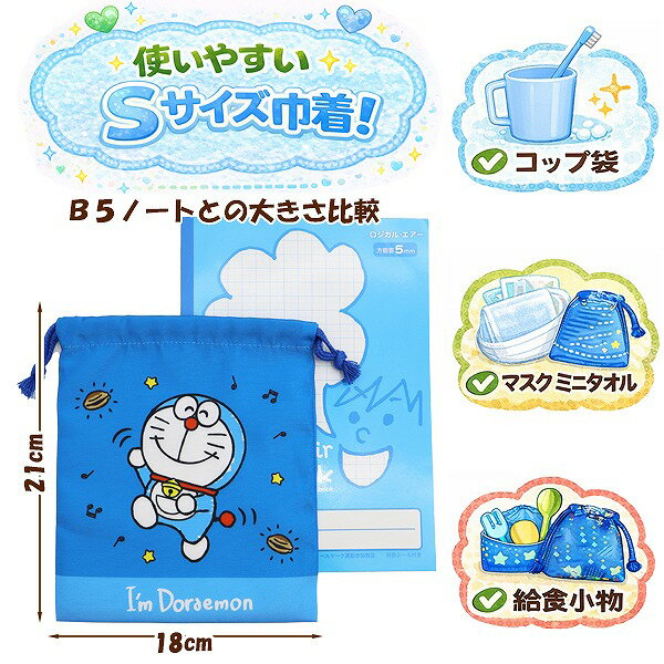 ドラえもん I'm Doraemon 巾着 3枚 セット 21×18cm 男の子 コップ 入れ 歯ブラシ マスク ポーチ 入園 入学 新学期 登園いろいろ使えて毎日便利!巾着3枚セット!●商品説明:入園・入学準備にぴったりな、使いやすいSサイズの巾着袋がうれしい3枚セット。毎日の通園・通学や習い事まで、幅広く活躍します。コップ袋や歯ブラシ、マスク、給食小物などを収納するのにちょうどいいサイズ感(約21×18cm)3枚セットだから、コップ用、マスク・ミニタオル用、給食小物用など使い分けができて整理しやすい。手洗いOKなので、汚れてもすぐに洗えて清潔。洗い替えにも安心。色分けして使えるので、姉妹・兄弟で分けて使うのもおすすめ。内側にはお名前が書けるタグ付き。通園・通学でも間違えにくく安心です。●カラー:ドラえもん●サイズ:ワンサイズ高さ21×幅18cm●素材:生地:ポリエステル100%、紐:ポリエステル100%
