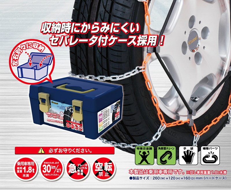アイコンの説明はこちら関連商品GneedラダータイヤチェーンGneed金属チェーン FG13 ラダーチェーン/ハシゴ型/乗用車向け/ジャッキアップ不要/ス…Gneed金属チェーン FG17 ラダーチェーン/ハシゴ型/乗用車向け/ジャッキアップ不要/ス…Gneed金属チェーン FG12 ラダーチェーン/ハシゴ型/乗用車向け/ジャッキアップ不要/ス…冬のオススメアイテム。ほうとう 9人前セット(3人前×3袋)もちもち生麺!クセになる美味しさ!平井屋 山梨…Gneed金属チェーン FG13 ラダーチェーン/ハシゴ型/乗用車向け/ジャッキアップ不要/ス…Sybilla(シビラ) フードショール ゴールド+ナチュラル 2着セット ウォッシャブル …アクアオーナー様におすすめの車用品。アクア専用 車検対応 日本製LEDライセンスバルブ2個 6000K相当 1年保証付き DAA-NHP…MXPK1# アクア専用 エアコンドリンクホルダー 運転席用 SY-A14 TOYOTA 運転席側用 細…YAC(ヤック)10系 アクア専用 フロントコンソール電源BOX SY-A6/DC12V 2口ソケット…商品説明 在庫処分のため特別価格にて提供致します!メーカー推奨売価6,980円のハシゴ型金属チェーンです。 コンパクトなハードケース入りで、万が一のチェーン規制時の備えにピッタリです。 軽くて丈夫な特殊合金鋼採用。 日本の老舗大手自動車部品メーカー、エンパイヤ自動車のPB製品なので、チェーンに求める性能や付属品を熟知していて、かゆいところに手が届く充実の内容です。 説明書はもちろん日本語で、写真入りでわかりやすく、安心です。 緊急時に使うものですから、お客様相談窓口が日本メーカーなのも大事なポイントです。 ・2つのチェーンがからみにくいセパレータ付きケース。 ・軍手、補修パーツ、取付説明シートなど、必要な付属品がしっかり備わっています。 ・ジャッキアップなしで装着可能です。 ハシゴチェーンは亀甲型やゴムチェーンと比べると乗り心地に劣りますが、手軽さやコンパクトさではハシゴチェーンが勝ります。 滅多にチェーンは付けないけど、万が一の時のために備えておきたい、という方に特にお勧めです! 製品仕様 品番:FG14 パッケージサイズ:H120×W260×D160mm 生産国:中国 適合クリアランス:3cm以上 適合タイヤ 夏タイヤ・冬タイヤ共通 165/80-13(165R13) 165/70-14(165/70R14)・175/60-14(175/60R14)・175/65-14(175/65R14)・185/55-14(185/55R14)・185/60-14(185/60R14) 175/55-15(175/55R15) ※ブリヂストン製スタッドレスは適合不可となります。 スタッフコメント アウトレット品の売り切り特価です! 店舗引き上げ品のため、箱にダメージがありますが、中身は未開封の新品です。 大変お買い得ですのでお早めにどうぞ! 注意事項 ※ブリヂストン製スタッドレスは適合不可となります。 ※この商品は生産終了のため特価にてご提供となります。 ※店舗より引き上げた製品がございます。ケースに汚れ、傷、貼付されたシールの部分的な剥がれ、テープによるシールの貼り直しなどが見られる場合がございます。中身は未開封ですのであらかじめご了承の上お買い上げください。 ※チェーンは消耗品です。ご購入後3年を目途に新たな商品に交換してください。(3年間品質を保証するという意味ではございません。使用状況により交換をご検討ください。) ※貨物自動車/トラック/1BOX/バンには装着不可。 ※車両重量が1.8t以上のお車には使用不可。 ※必ずタイヤのサイズが合っている事と、チェーンを装着する場所(タイヤハウス、フェンダーの内側、サスペンションとの隙間)が3cm以上あいている事をご確認下さい。(ハンドルをいっぱいに切った状態でも隙間がある事をご確認下さい) ※夏タイヤと冬タイヤで適合が異なる場合がございます。必ず説明文内のタイヤサイズをご確認の上お買い上げください。 ※タイヤサイズが合っていても車種やホイールサイズの変更をしている場合などは装着できない可能性がございます。通販の特性上、実際のお車を確認できないため、当店で適合のお問い合わせにはお答え致しかねます。 ※製品不良以外の理由での開封後の返品はお受け致しかねますので、開封前に適合をよくご確認下さい。 ※商品には万全を期しておりますが、商品のお受け取り後は、内容物に破損や不足がないか、十分ご確認ください。 ※実際にご利用いただく前に試着をしていただき、正しく装着できる事をご確認下さい。 ※一般的なチェーンと同様、タイヤ2本分が入っています。駆動輪に装着してください。 ※装着時は必ず時速30km/h以下で走行してください。 ※ほとんどのチェーンは雪上以外で走行するとすぐに摩耗してしまいます。雪道以外ではできるだけ速やかにチェーンを取り外してください。 ※急ブレーキ・急加速・急ハンドルなどの操作は避けて下さい。 ※空転は絶対に行わないでください。 ※付属のゴムバンドについて 装着時に「ゴムバンド(サイドバンド)が掛けにくい」というお問い合わせをいただくことがございます。 タイヤチェーンは走行時に遠心力で外側に引っ張られます。そのため、当商品のゴムバンドは、チェーンと車
