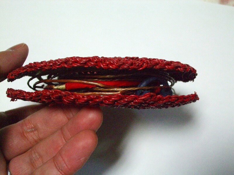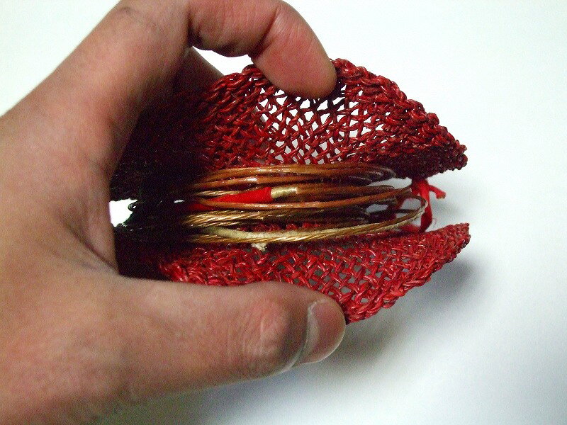 左から 上の段、ピンク・赤(暗めの赤です)・紺 下の段 緑・黒 入荷時期により多少の色違いがございます。 内径:約5.5cm、外径:約12cm 編込みのため口が柔らかく弦を取り出しやすいです! 口が広く広がる為、取り出す際に弦を傷めにくいです! 口は広がりますが、持ち歩きの鞄の中で弦が飛び出していた、ということは私が使用した間ではありません。 自然素材を染めて手編みのため形状・色に多少のバラツキがあります。