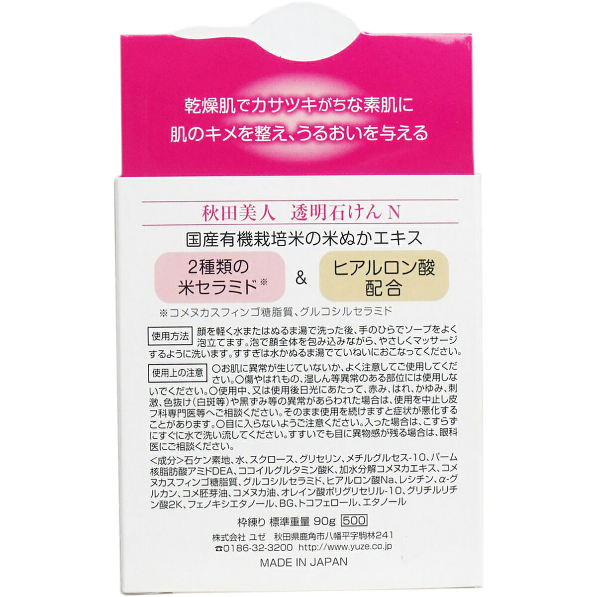 【化粧品】【成分】石ケン素地、水、スクロース、グリセリン、メチルグルセス-10、パーム核脂肪酸アミドDEA、ココイルグルタミン酸K、加水分解コメヌカエキス、コメカスフィンゴ糖脂質、グルコシルセラミド、ヒアルロン酸Na、レシチン、α-グルカン、コメ麦芽油、コメヌカ油、オレイン酸ポリグリセリル-10、グリチルリチン酸2K、フェノキシエタノール、BG、トコフェロール、エタノール【使用方法】顔を軽く水またはぬるま湯で洗った後、手のひらでよく泡立てます。泡で顔全体を包みながら、やさしくマッサージするように洗います。すすぎは水かぬるま湯でていねいに行ってください。【使用上の注意】・お肌に異常が生じていないかよく注意してご使用ください。・傷やはれもの、湿疹等、異常のある部分にはお使いにならないでください。・使用中、または使用後日光に当たって、赤味、はれ、かゆみ、刺激、色抜けや黒ずみ等の異常があらわれた場合は使用を中止し皮膚科専門医等にご相談ください。そのまま本品の使用を続けますと、症状を悪化させることがあります。・目に入らないようにご注意ください。万一目に入ったときは、こすらずにすぐに水で洗い流してください。すすいでも目に異物感が残る場合には、眼科医にご相談ください。【化粧品】【成分】石ケン素地、水、スクロース、グリセリン、メチルグルセス-10、パーム核脂肪酸アミドDEA、ココイルグルタミン酸K、加水分解コメヌカエキス、コメカスフィンゴ糖脂質、グルコシルセラミド、ヒアルロン酸Na、レシチン、α-グルカン、コメ麦芽油、コメヌカ油、オレイン酸ポリグリセリル-10、グリチルリチン酸2K、フェノキシエタノール、BG、トコフェロール、エタノール【使用方法】顔を軽く水またはぬるま湯で洗った後、手のひらでよく泡立てます。泡で顔全体を包みながら、やさしくマッサージするように洗います。すすぎは水かぬるま湯でていねいに行ってください。【使用上の注意】・お肌に異常が生じていないかよく注意してご使用ください。・傷やはれもの、湿疹等、異常のある部分にはお使いにならないでください。・使用中、または使用後日光に当たって、赤味、はれ、かゆみ、刺激、色抜けや黒ずみ等の異常があらわれた場合は使用を中止し皮膚科専門医等にご相談ください。そのまま本品の使用を続けますと、症状を悪化させることがあります。・目に入らないようにご注意ください。万一目に入ったときは、こすらずにすぐに水で洗い流してください。すすいでも目に異物感が残る場合には、眼科医にご相談ください。