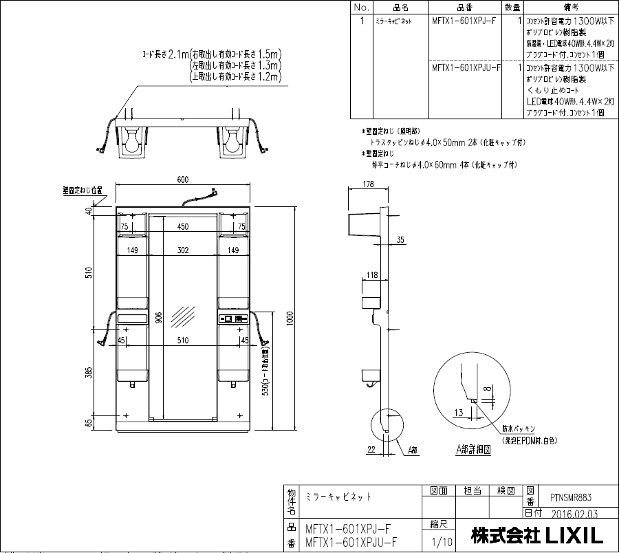 LIXIL,INAX洗面台,リフラシリーズ用,間口600mmミラーキャビネット(全高1850ミリ用,1面ロング鏡,LED照明,トレイ・コンセント付)MFTX1-601XPJ-F