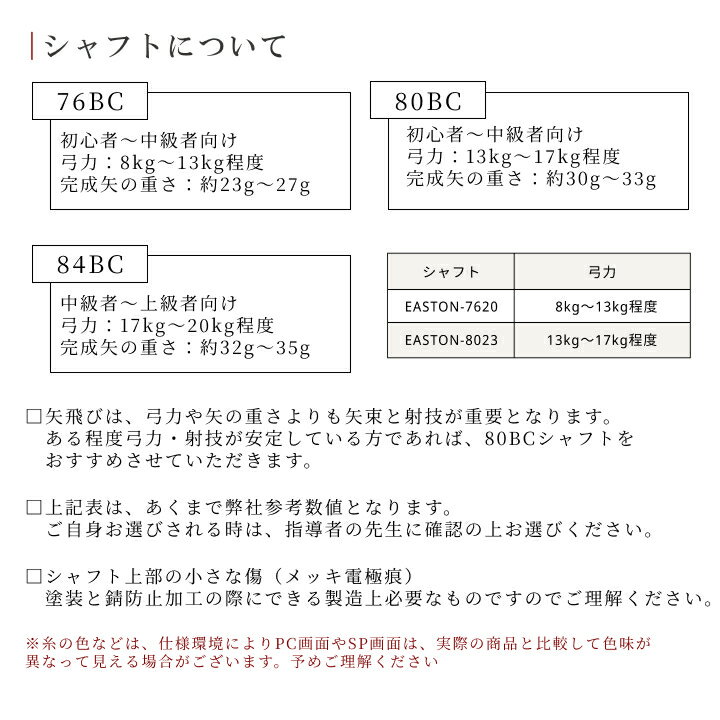 |弓道 ミズノ カーボン シャフト 和弓用に商品開発されたスポーツメーカーミズノ社製弓道用カーボンシャフトです。国内のスポーツメーカーの技術でつくられた最高品質のカーボン矢になります。 竹矢と比べ湿度で変形することなく、外力に対する耐久性、均一性に優れ、 他社カーボン矢に比べて見た目も品質も高いカーボン矢になります。素材の特性を活かした、しなやな箆張による矢勢はもちろんこと、遠くに飛ばす力を持ったシャフトです。 |弓道の矢 −MIZUNO Carbon− 弓道用の矢は竹を加工して製作しておりました。竹を切り、選別し矢を製作します。このため竹の矢は、非常に高価なものとなってきました。 そこで、現代弓道では、カーボンによりその弓道の持つ文化的な一面を再現し、金属矢としてより竹矢に近い色と風合を再現しております。数あるカーボンシャフトから、近的用として、ミズノ社のWENEWシリーズより84BC・80BC・76BCの3つのシャフトサイズを選びました。 矢尺が95cm以下弓力が13kg以下の方は76BCシャフト 矢尺が95cm以上弓力が13kg以上の方であれば80BC・84BCシャフトをオススメさせていただきます。 近的競技においての安定飛翔をする上で十分な品質を持った弓道用の矢としてシャフトサイズで迷われることないように厳選いたしました。 【商品詳細】 弓道 近的用 カーボン矢 MIZUNOシャフト 6本組 ■羽根種別:黒手羽 ■シャフト:WENEW76BC ■付属品:ミズノ純正筈4個・矢尻2個