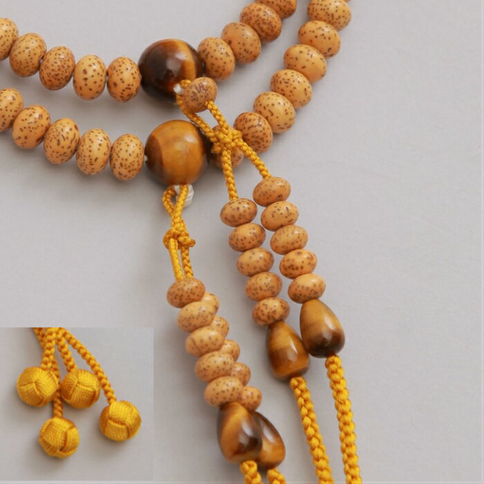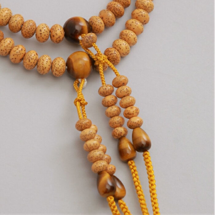 幅広く各巡礼にお使いいただける百八玉、本連の念珠です。 尺三寸。大粒の平玉で重厚感があります。初めて巡礼する方からベテランまで幅広い方にお使いいただけます。 星月菩提樹、虎目石仕立