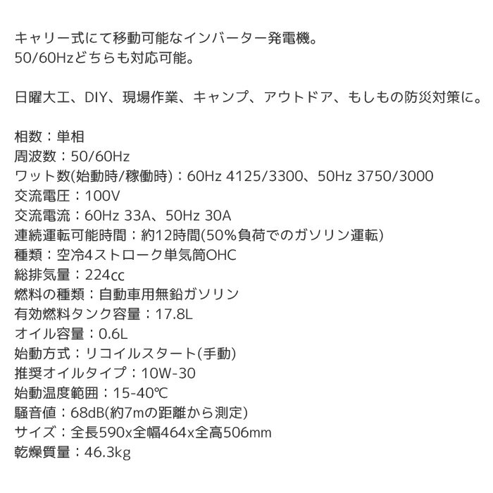 キャリー式にて移動可能なインバーター発電機。 50/60Hzどちらも対応可能。 日曜大工、DIY、現場作業、キャンプ、アウトドア、もしもの防災対策に。 相数:単相 周波数:50/60Hz ワット数(始動時/稼働時):60Hz 4125/3300、50Hz 3750/3000 交流電圧:100V 交流電流:60Hz 33A、50Hz 30A 連続運転可能時間:約12時間(50%負荷でのガソリン運転) 種類:空冷4ストローク単気筒OHC 総排気量:224? 燃料の種類:自動車用無鉛ガソリン 有効燃料タンク容量:17.8L オイル容量:0.6L 始動方式:リコイルスタート(手動) 推奨オイルタイプ:10W-30 始動温度範囲:15-40℃ 騒音値:68dB(約7mの距離から測定) サイズ:全長590x全幅464x全高506mm 乾燥質量:46.3kgChampion Power Equipment(チャンピオン) プロパワー発電機3300 3.3kVA 500559-JChampion Power Equipment(チャンピオン) GGGガスガソリン発電機3800 3.8kVA 501003-J