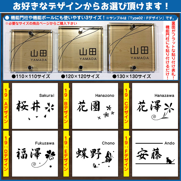 アクリル表札 ネームプレート 二層板表札 クリスタル Type19:2点ビス仕様【120×120mm】 人気の機能門柱や平らな面に貼って使える便利な表札! 販売条件 ◆詳しくはこちらをご確認ください サイズ W120×H120×T26mm 約220g カラー カラーサンプルをご確認ください 仕様 表札(取付可能場所:郵便ポスト・機能門柱・機能ポール・門扉・ガラス・扉・その他凹凸の無い場所) デザイン:6種(文字数やデザインにより文字位置や文字サイズが多少異なります。) ※取付け用「両面テープ」・「強力ボンド」は別売です。必要に応じてご用意ください。 材質 ステンレス(ネジ)/アクリル板(キャスト板)/アクリル系樹脂(二層板) セット内容 ■二層板表札 クリスタル Type19:2点ビス仕様(サイズ:120×120mm) 備考・注意 ※商品はポスト投函での配達となります。 ※レイアウト確定後、5日~10日程度で出荷となります。注文状況によりお時間が必要になる場合があります。 ※イメージ画像はイメージサンプルとして販売内容以外の商品があります。必ず内容を確認ください。 ※イメージ画像は使用するブラウザ・モニターにより色が違って見える場合があります。 ※商品の取り付け方法については施工方法を参考に、施工場所にあった取り付けを行ってください。 オプション ●両面テープ(3M 強力両面シート 外壁用) ●強力接着剤(ウルトラ多用途SU クリヤー) 分類 【表札】【貼り付けタイプ】【アクリル製】【二層板表札】【クリスタル】【2点ビス】【Type19】【サンガーデンエクステリア】 ◆メーカー希望小売価格はメーカーカタログに基づいて掲載していますアクリル表札 二層板表札 クリスタル(サイズ:110角・120角・130角) 二層板表札 クリスタルは、平らな面ならどこでも使える、貼るだけカンタン取り付けが可能な便利な表札です。 サイズも110角(110×110mm)、120角(120×120mm)、130角(130×130mm)の3パターンあり、壁面だけでなく「機能門柱・機能ポールにも対応可能」です! 1世帯住宅用のデザインだけでなく、2世帯住宅用のデザインなど多彩なデザインをご用意致しました。お値段はサイズごとに全て同じ!お好みのデザインでご注文ください♪ ◆取付可能場所(参考)※下記参考取付イメージ「ルシアス ウォール SD01型 照明無しタイプ」 ●機能門柱(ルシアスポストユニット など表札取り付けスペースが110mm~130mm以上ある機能ポール) ●平らな壁面(ガラス・コンクリートブロック・扉 など屋外・屋内問わず貼り付け使用可能) ●その他オススメの組み合わせ ※未掲載商品をお探しの方はお問い合わせください! 【ユニソン】 クルム2・コルディア・ケイト・リピットDB・フロリア・バロ・テラ2・ヴィコDB・ヴィコWH・ボルサ・ピアット・プラスト・アンテ・ヴィルク・イオス・ヴィコBI・ルージュ・コラーナ・オスト・リーダ・クティ・ベリエ・ミース・コルディアラック・コルディアラック2・ファミアージュライト・ヴィコDB門柱スタンド・カーサDR・カーサAD・フォレスコネクトST・ND・フォレスポール・ファミアージュ アクシスS・アクシス・フォルガコネクト・フォルガS・フォルガポール 【YKKap】 ルシアス 宅配ボックス・ポスティモ 宅配ボックス・独立型ポスト フィッテ・ポスティモ・G3型・G4型・エクステリアポスト T4型・T5型・T6B型・T9型・T9R型・T9L型・T10型・T11型・T12型・T13型・T14型・プリュード ポスト・FX01型・FX02型・FX03型・Jポスト・HS1型・BA14型・ルシアス ウォール NA01型 NB01型 NC01型 RH01型 RH02型 HH02型 HH03型 NH01型 NH02型 NH03型 PH01型 BE01型 RE01型 RE02型 HE02型 HE03型 NE01型 NE02型 NE03型 PE01型 WD01型 WD02型 SD01型 HF01型 ・ルシアス ポストユニット WA01型 WB01型 WC01型 WD01型 WE01型 SA01型 SB01型 SC01型 SD01型 SE01型 SA02型 SB02型 SC02型 SD02型 SE02型 KA01型 KB01型 KC01型 KD01型 KE01型 PA01型 PB01型 PC01型 PD01型 PE01型 CA01型 CB01型 CC01型 CD01型 CE01型 HC01型 HD01型 HE01型 HA01型 HB01型 HH02型 HD02型 HE02型 HD03型 ルシアス宅配ボックス1型 ルシアス宅配ポスト2型 ポスティモ宅配ボックス1型 シンプレオ宅配ボックス2型・ポスティモα3 ポスティモαIII C型 D型・ルシアス 機能門柱 A01型 B01型 独立仕様 門柱仕様・シャローネ ポストユニット S01型 S02型 S03型 S04型 S05型・シャローネ 機能門柱1型 サンドブラスト1型 独立仕様・シャローネ 機能門柱2型・シンプレオ ポストユニット 1型・カスタマイズ ポストユニット・エレポルト 機能門柱1型 独立仕様 門柱仕様・スタンダード ポストユニット 3型・ルシアス サインポール A01型 A02型 A03型 B01型・ルシアス アクセントポール 1型・ルシアス スリムアクセントポール 1型 【三協アルミ】 フレムスLight・S型・P型・SWE型・SWC型・JWHP型・SMA型・SWM-S型・SWD型・STS-1N型・STS-2N型・KA型・BA型・HA型・HS型・OS型・SON型・SOV型・SOR型・SKU型・機能ポール・ジオグランデ・ステイム・アクセンティア・フレムス・セレージュ・モデア2・スリムモダン・マクリズムM・ジアル・マクリズムP・スララ・クルポ・コレット・ファノーバ2・エスポ2・エレニー 【LIXIL / リクシル】 スマート宅配ポ