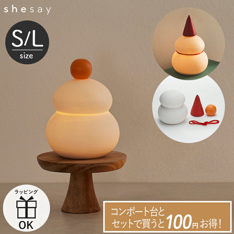 メーカー希望小売価格はメーカーカタログに基づいて掲載していますShesay 半磁器LEDライト 鏡餅/雪だるま 毎年飾れるのが嬉しい 鏡餅と雪だるまの2WAYライト 真っ白な半磁器(ストーンウェア)を使った雪だるまのオブジェです。 LEDライトが内蔵されており、飾り棚でちょっとした間接照明としても。 クリスマスシーズンには、お手持ちのクリスマスオブジェと一緒に飾って楽しんでいただけます。 マットな質感を活かしてクリスマスの後にはお正月飾りの鏡餅としても使え、 綺麗な姿をずっと楽しめるのが魅力の一点です。 付属で飾り紐、ウッドでできた雪だるまの帽子、鏡餅の橙がセットされるので、 お好みの飾り方をお楽しみください。 温かみのあるLEDライト ライトの電源を入れれば、ぼんやりと光る温かみのあるLEDライトになります。 取り外し可能な付属パーツ Lサイズ・Sサイズに共通で付属する「みかん」「三角ぼうし」「紐」の3点。 取り外し可能なので、お好みの飾り方でご使用頂けます。 パーツを入れ替えると、鏡餅と雪だるまの2WAY仕様で長くお楽しみ頂けます。 DETEAL 半磁器(ストーンウェア)とは、素焼きのようなマットで素朴なテクスチャが特徴で、 陶器の柔らかくあたたかみのある印象はそのままに、磁器よりも耐久性が高く、割れにくい素材です。 商品の裏側から電池交換ができます。 SIZE 相性抜群!お得なコンポート台とのセット販売もご用意しました 【商品詳細】 商品名:Shesay 半磁器LEDライト 鏡餅/雪だるま (鏡餅) ・Lサイズ 最大直径6×高さ6.5cm 付属パーツ:(帽子)底部直径3×高さ4.5cm (橙)最大直径2.5×高さ2cm ・Sサイズ 最大直径8×高さ9cm 付属パーツ:(帽子)底部直径3×高さ4.5cm (橙)最大直径2.5×高さ2cm 素材:半磁器(ストーンウェア)/LEDライト 付属パーツ:木 飾り紐:ポリエステル (コンポート) ・Sサイズ 上部直径8cm×高さ5cm ・Mサイズ 上部直径10cm×高さ6cm 素材:アカシアウッド 備考:電池付(CR2032) 連続点灯時間約72時間(電池の種類や使用環境ご使用の頻度によって異なります) 【ラッピングについて】 ラッピングは一点100円(税込)で承っております。 ご希望のかたはこちらをご購入ください。