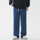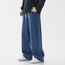 【送料無料】[netero] ワイド デニムパンツ メンズ ジーンズ 無地 ジーパン 調整紐 イージー ワイドパンツ 秋 冬 春 色:ブルー、サイズ:XL