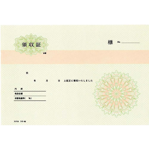 メーカー コクヨS&T株式会社 KOKUYO 品名 BC複写領収証(バックカーボン) 品番 ウケ-65 サイズ B6・ヨコ型 128・188mm 仕様 ヨコ書き・三色刷り 組数 50組 複写枚数 2枚 備考
