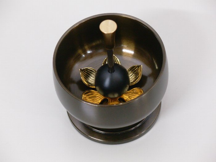 豆りん 桜彫 素材:りん/真鍮 棒/真鍮・黒檀 色:黒 寸法:りん/直径5.5cm 高さ4.4cm りん棒/長さ5.1cm