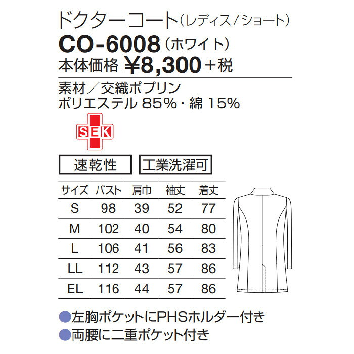 オンワード 白衣 ドクターコート スリム レディース ショート丈 ブランド シングル おしゃれ 診察衣 実験衣 薬局衣 CO-6008