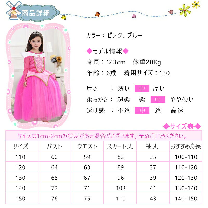 商品情報内容お姫様になりたいお子様の夢をかなえるドレスです♪カラー:ブルー、ピンク(※ご使用のモニタ等により、画像の色味が実物と若干異なる場合がございます。)サイズ110サイズバスト60cm ウエスト59cm 袖丈35cm スカート丈82cmおすすめ身長100-110cm120サイズバスト64cm ウエスト63cm 袖丈37cm スカート丈89cmおすすめ身長110-120cm130サイズバスト68cm ウエスト67cm 袖丈39cm スカート丈96cmおすすめ身長120-130cm140サイズバスト72cm ウエスト71cm 袖丈41cm スカート丈103cmおすすめ身長130-140cm150サイズバスト76cm ウエスト75cm 袖丈43cm スカート丈110cmおすすめ身長140-150cm※測定手動により1-2cmの誤差が出る場合がございます。プリンセスドレス ワンピース 女の子 キッズ 子供 コスプレ ハロウィン 仮装 プリンセス 110-150 眠る美女風 ドレス ワンピース プリンセス コスプレ sleeping beauty 【お姫様になりたいお子様の夢をかなえるドレス】sweetsweetshop お姫様になりたいお子様の夢をかなえるドレスです♪カラー:ブルー、ピンク(※ご使用のモニタ等により、画像の色味が実物と若干異なる場合がございます。)110サイズバスト60cm ウエスト59cm 袖丈35cm スカート丈82cm おすすめ身長100-110cm120サイズバスト64cm ウエスト63cm 袖丈37cm スカート丈89cm おすすめ身長110-120cm130サイズバスト68cm ウエスト67cm 袖丈39cm スカート丈96cm おすすめ身長120-130cm140サイズバスト72cm ウエスト71cm 袖丈41cm スカート丈103cm おすすめ身長130-140cm150サイズバスト76cm ウエスト75cm 袖丈43cm スカート丈110cm おすすめ身長140-150cm※測定手動により1-2cmの誤差が出る場合がございます。 ワンピースを着るだけでプリンセスに変身♪ 青色とピンク色があり、おしゃれで可愛いお姫様♪ 拘りの裁縫、お子様の夢を叶えます♪ テーマパークやクリスマスイベントへ行かれる方♪ 仮装パーティーやハロウィンイベントに参加される方♪ 普段でもお姫様気分を味わいたい方♪ 眠れる森の美女のドレスが登場♪ブルーとピンクの2色があり、お姫様になりたいお子様にぜひおすすめいたします。テーマパーク、クリスマス、ハロウィーンパーティー、仮装パーティー等にこれから行かれる方におすすめします。または、お子様のプレゼントとしておすすめいたします。 【在庫がある場合】翌営業日にご出荷いたします。 1