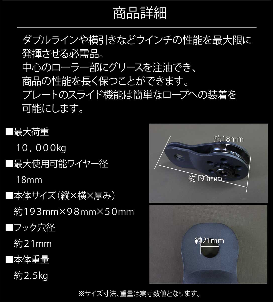 ■商品コード35378016■メーカーC.L.LINK/シーエルリンク■商品名スナッチブロック 10t 18mm ワイヤー対応 1個■商品説明ダブルラインや横引きなどウインチの性能を最大限に発揮させる必需品。中心のローラー部にグリースを注油でき、商品の性能を長く保つことができます。プレートのスライド機能は簡単なロープへの装着を可能にします。【最大荷重】10,000kg【最大使用可能ワイヤー径】18mm【本体サイズ】(縦×横×厚み)約193mm×98mm×50mm【フック穴径】約21mm【本体重量】約2.5kg■注意事項■納期メーカー取り寄せ品の為、通常即日〜4営業日以内に発送致します。■ご注文時注意事項【重要】送り先ご住所がカーショップ、整備工場、その他法人様宛の場合のみ送料無料となります。ご注文時には法人様ご住所でご注文いただきますようお願いいたします。 ※ ご注文前に必ずご確認下さい お急ぎの場合はご購入前に納期確認をお願い致します。 納期について *メーカー在庫が欠品の場合、改めて納期をご連絡致します。 *メーカーにて予告無く廃番、仕様変更になっている場合があります。 返品・キャンセルに関して *お客様都合による返品・キャンセル・商品の変更は一切お受けしておりません。 *在庫・納期・適合未確認でご購入された商品のキャンセルは一切お受けしておりません。 *代引きで納期が半年以上の商品をご注文の場合はキャンセルさせていただきます。別の決済方法でご注文下さい。