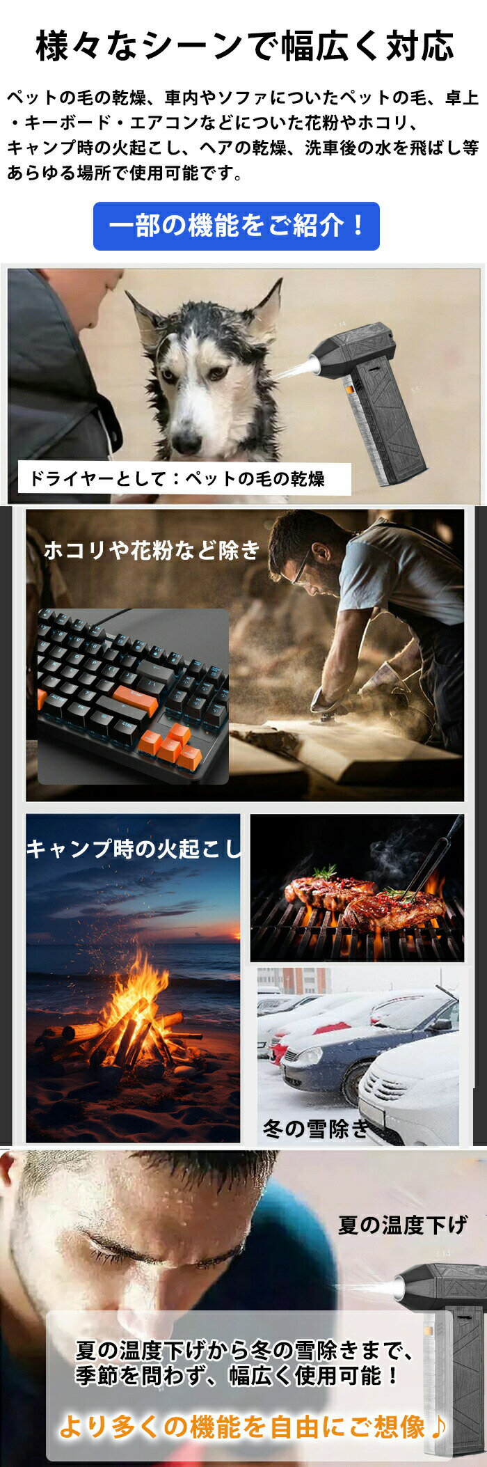 2024年最新 洗車 ミニジェットファン ハイパワー電動送風機 強力 ターボジェットファン エアダスター ペットドライヤー 強力 130000RPM 52M/S 8000mAh大容量 送風機 ブロアー 家庭用 小型 無段階風量調整 ブロワージェット ジェットブロワー ミニブロワー エアダスター電動ミニジェットファン 強力扇風機 除雪 除塵ファン 手持ち 電動工具 手持ち式 車/キーボード 掃除 屋外クリーナー 凍結防止 雪対策 洗車や車内のホコリ飛ばし 落ち葉掃除 花粉 洗車後の水滴、車内の細かい埃取り 除雪装置 ポケットジェットファン 日本語取扱説明書 安全ハンマ商品情報検索キーワード:2024年最新 洗車 ミニジェットファン ハイパワー電動送風機 強力 ターボジェットファン エアダスター ペットドライヤー 強力 130000RPM 52M/S 8000mAh大容量 送風機 ブロアー 家庭用 小型 無段階風量調整 ブロワージェット ジェットブロワー ミニブロワー エアダスター電動ミニジェットファン 強力扇風機 除雪 除塵ファン 手持ち 電動工具 手持ち式 車/キーボード 掃除 屋外クリーナー 凍結防止 雪対策 洗車や車内のホコリ飛ばし 落ち葉掃除 花粉 洗車後の水滴、車内の細かい埃取り 除雪装置 ポケットジェットファン 日本語取扱説明書 安全ハンマスペック商品名:ハイパワー電動送風機バッテリー容量:8000mAh定格出力:15W回転数:最大13万PRM+/-10%最大電力:120W電圧:7.4V充電時間:2Hサイズ:約140*80*46mm重量:約297gファンの数:13枚セット内容:商品本体+USB充電ケーブル+日本語取扱説明書生産口:中国【強力電動送風機】高速ベアリングと13枚合金ファンを備えた強力ミニジェットファンです!最大風速 52m/s を超えた優れた性能を発揮し、強力で効率的なエアフローを確保します。【様々なシーンで幅広く対応】ペットの毛の乾燥、車内やソファについたペットの毛、卓上キーボードエアコンなどについた花粉やホコリ、キャンプ時の火起こし、ヘアの乾燥、洗車後の水を飛ばし等あらゆる場所で使用可能です。【最大風速 52m/s を超える優れた性能】プレミアム高速ベアリングで最大風速52m/sを超えた圧力と速度を生成し、強力で効率的なエアフローを確保します。【130000RMP回転分&大容量の電池】エアロアルミニウム合金を採用することで、通常よりも90%強力なブロー力を提供し、モーター速度は最大130000RMPまで達します。高性能の8000mAhバッテリーが内蔵し、一回の充電で長時間使用することはできます。【無段階の速度調整が可能】無段階の速度調整機能搭載し、お好みに応じてより正確で風速をコントロールできます。【収納便利&ノズル追加可能】片手でも持ちやすく、手軽に引き出しや車の中に収められ、スペースを取らず収納楽々♪さらにノズルまで追加できます!【過熱保護機能搭載】過熱保護を備えて、95℃を超えた過熱の場合、すぐ自動的に電源を切ります。安全性アップ!【ミニ軽量コンパクトな設計】カバンに入れるミニコンパクトな設計により、手のひらサイズで、長い時間使用しても腕に疲れにくいです。注意生産時期により飾り物の色が均一できない場合がございます。不良品ではありません。PC環境光の具合により、色や素材のイメージが写真と若干異なる場合がございます。モデル写真に使用されているアクセサリー小物は別途記載が無い限り付属いたしません。【ご注文の前にご確認ください】オーダー商品ですので、作業を開始いたしました後の内容の変更キャンセル等はお受けできません。内容の変更キャンセルをご希望の場合には、必ず最終進行前にお申し出いただきますようお願いいたします。レイアウト(完成見本)はサンプルのため、仕上がりに多少の差異が出ることがございますが、原則的にオーダーメイド品のご返品はお受けできかねますので、予めご了承ください。2024年最新 洗車 ミニジェットファン ハイパワー電動送風機 強力 ターボジェットファン エアダスター ペットドライヤー 強力 130000RPM 52M/S 8000mAh大容量 送風機 ブロアー 家庭用 小型 無段階風量調整 ブロワージェット ジェットブロワー ミニブロワー エアダスター電動ミニジェットファン 強力扇風機 除雪 除塵ファン 手持ち 電動工具 手持ち式 車/キーボード 掃除 屋外クリーナー 凍結防止 雪対策 洗車や車内のホコリ飛ばし 落ち葉掃除 花粉 洗車後の水滴、車内の細かい埃取り 除雪装置 ポケットジェットファン2024年最新 洗車 ミニジェットファン ハイパワー電動送風機 強力 ターボジェットファン エアダスター ペットドライヤー 強力 130000RPM 52M/S 8000mAh大容量 送風機 ブロアー 家庭用 小型 無段階風量調整 ブロワージェット ジェットブロワー ミニブロワー エアダスター電動ミニジェットファン 強力扇風機 除雪 除塵ファン 手持ち 電動工具 手持ち式 車/キーボード 掃除 屋外クリーナー 凍結防止 雪対策 洗車や車内のホコリ飛ばし 落ち葉掃除 花粉 洗車後の水滴、車内の細かい埃取り 除雪装置 ポケットジェットファン 日本語取扱説明書 安全ハンマ商品情報検索キーワード:2024年最新 洗車 ミ