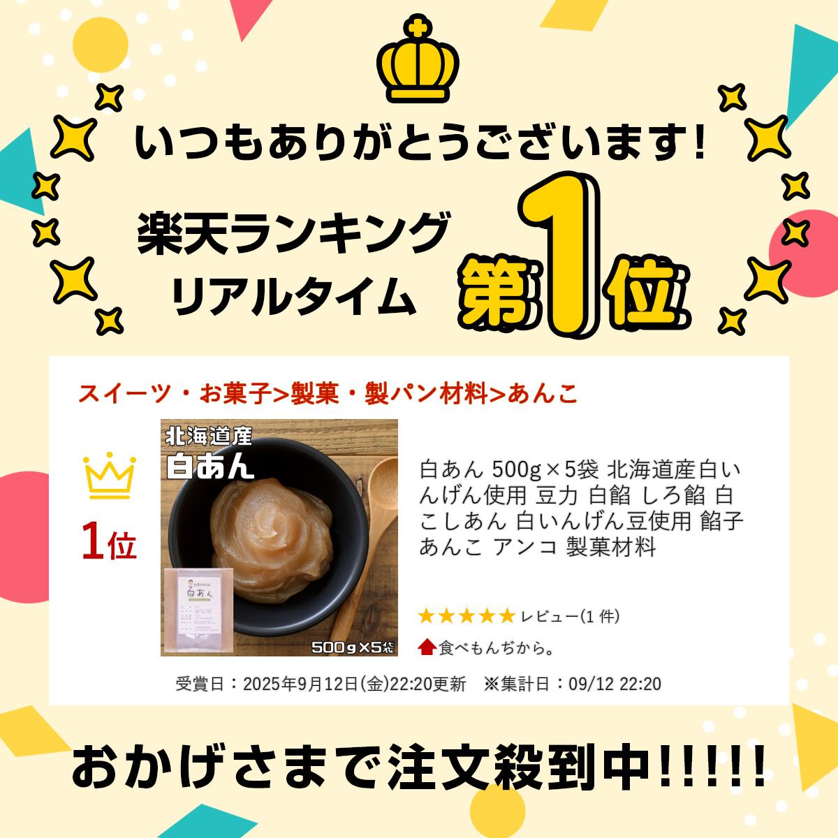 内容量 1袋 500g×5袋 賞味期限 製造から60日 保存方法 常温(直射日光、高温多湿を避けて保存してください。) 原材料 手亡豆(北海道産)、砂糖、水飴、寒天 商品説明 北海道で作られた白インゲン豆を使用し、豆本来のおいしさ・風味を残して丁寧にたきあげました。糖度は、少なめに上品な甘さに仕上げております。保存料、着色料は使用しておりません。 【100gあたり栄養成分】 エネルギー238.6kcal,水分39.93g、たんぱく質5.76g、脂質0.55g、炭水化物53.50g、灰分0.24g、ナトリウム5.5mg 配送方法 安心の宅配便なので他商品も無制限で同梱可能便 お召上がり方 そのままでもお召上がり頂けます。あんぱん、おはぎ、大福、蒸まんじゅうなど。