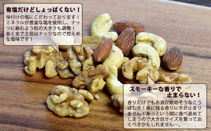 商品名燻製ナッツ 中(270g)内容量270g原材料アーモンド、クルミ、カシューナッツ、塩 ●当工場では、小麦、そば、卵、乳成分、落花生、エビ、かにを含む製品を製造しています。保存方法直射日光、高温、多湿を避け、常温で保存賞味期限180日配送形態メール便(日本郵便ゆうパケット)製造者株式会社シーズ 宮城県仙台市若林区卸町2-6-5 商品名燻製ナッツ 中(270g)内容量270g原材料アーモンド、クルミ、カシューナッツ、塩 ●当工場では、小麦、そば、卵、乳成分、落花生、エビ、かにを含む製品を製造しています。保存方法直射日光、高温、多湿を避け、常温で保存賞味期限180日配送形態メール便(日本郵便ゆうパケット)製造者株式会社シーズ 宮城県仙台市若林区卸町2-6-5職人がこだわって燻した大変美味しい燻製ナッツです!桜のチップを100%使い長年研究を重ね上品で芳醇な香りを作り出すことに成功しました。 味付けには海水100%ミネラルたっぷりの粗塩をパウダー状に挽いて丁寧に味付けしています。 さらにアメリカでは美容と健康に良いということで健康食品として認知されております。味付けはミネラル豊富な粗塩を使っています!荒いままだとナッツとの相性が悪いのでナッツに合わせて塩の粒子を調整! 「有塩ナッツを買ったけど、しょっぱかった!」 「塩味がついてるとヘルシーじゃないのでは?」など有塩であることに抵抗を感じる方もいるかもしれませんが、塩は控えめでマイルドな味わいなのでご安心ください! ※60%減塩タイプもあります。ナッツの栄養をご紹介! 関連商品はこちら燻製ナッツ 極【きわみ】 小(80g) ...燻製ナッツ 極【きわみ】 小(80g)×2...燻製ナッツ 極【きわみ】 大(450g)