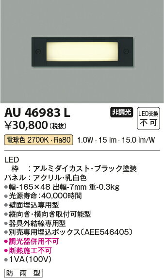 LED(電球色)LED1.0Wランプ:LED●アルミダイカスト・黒色塗装●パネル:アクリル・乳白色●幅-165×48 出幅-7mm 重-0.3kg●消費電力:1.0W●定格光束:15 lm●色温度:2700K●演色性:Ra80●光源寿命:40000時間●壁面埋込専用型●縦向き・横向き取付可能型●断熱施工不可●器具外結線専用型●別売専用埋込ボックス〔AEE546405〕●調光器との併用はできません検索用カテゴリ9【LED照明】 【電球色】 【非調光】 【防雨】