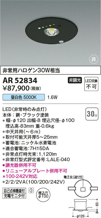 LED(昼白色)非常用ハロゲン30W相当LED(非常時のみ点灯)本体:鋼・黒色塗装幅-φ120 出幅-8 埋込穴径-φ100 埋込高-83mm 重-0.6kg◆消費電力:1.6W◆色温度:5000K◆蓄電池容量30分◆中天井用(〜6m)◆取付可能天井厚5〜25mm◆蓄電池:ニッケル水素電池◆適合蓄電池:7H15DA◆非常点灯時光束:1120lm◆非常灯型式評定番号:LALE-040◆調光器併用不可◆リニューアルプレート併用不可※100〜242V対応タイプ【当店おすすめ品】 【LED照明】 【非常用】 【昼白色】 【非調光】 【DL埋込穴100】検索用カテゴリ14