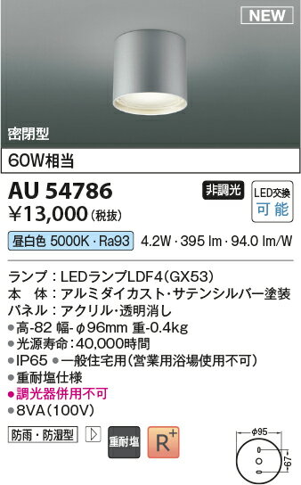 コイズミ照明 AU54786 エクステリア 軒下用LEDシーリングライト ランプタイプ 重耐塩仕様 密閉式 白熱球60W相当 非調光 昼白色 照明器具