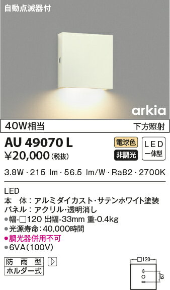 ★コイズミ AU49070L 【数量限定 お買得品】 エクステリア LED一体型 表扎灯 arkiaシリーズ 自動点滅器付 下方照射 非調光 電球色 防雨型 白熱球40W相当 照明器具 屋外用 玄関用照明