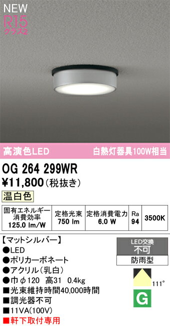 オーデリック OG264299WR エクステリア LEDシーリングライト 最廉価タイプ R15高演色 クラス2 白熱灯器具100W相当 非調光 温白色 111°拡散配光 要電気工事 照明器具 屋外用 軒下用