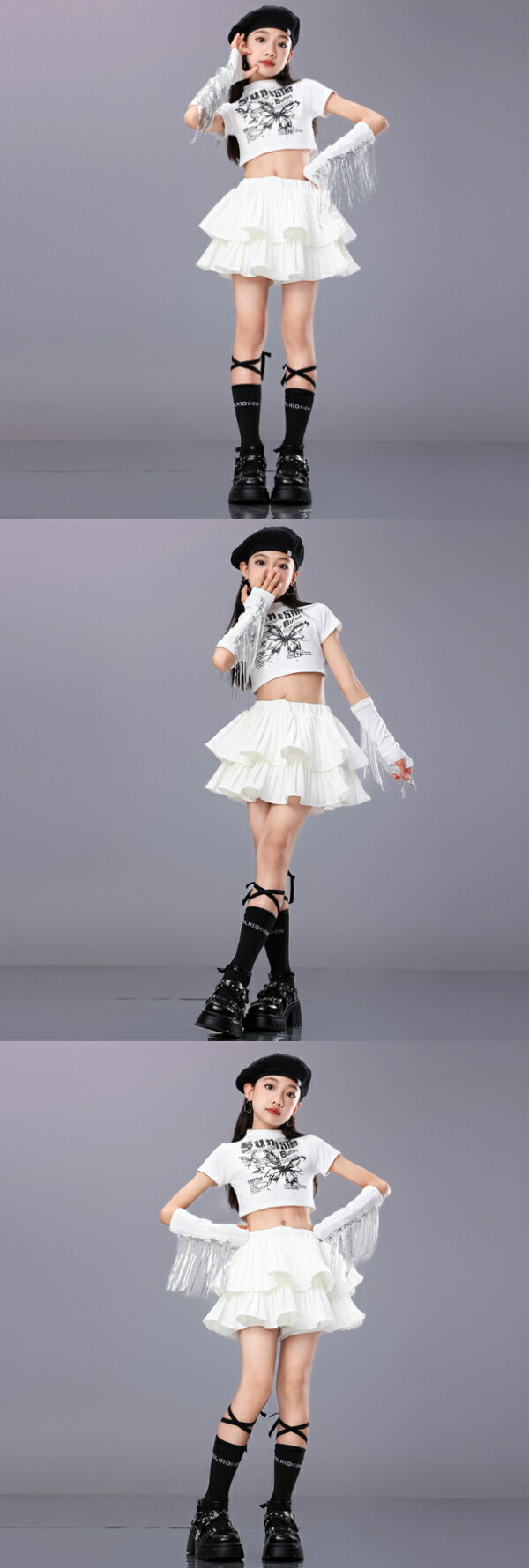 ホワイト 白 シフォン キラキラ ステージ衣装 キッズ ダンス衣装 ヒップホップ ジャズ 女の子 ジャズダンス セットアップ チア 子供服 ヘソ出し トップス パンツ k-pop jazz hiphop ファッション 練習着 ガールズ 上下セット ジュニア K-POP 韓国 ダンスウェア 団体演出