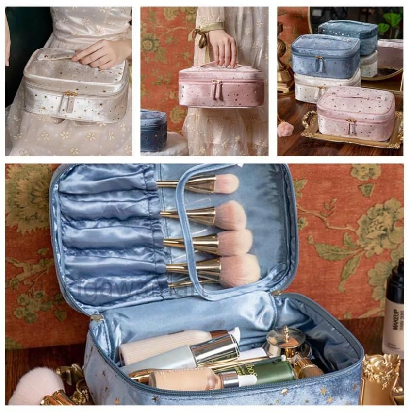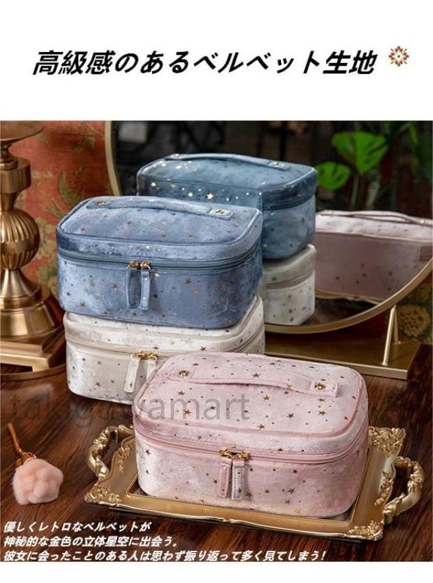 化粧ポーチ メイクポーチ バニティポーチ コスメポーチ 大容量 ベロア 収納ポーチ 化粧道具 かわいい 化粧品収納 携帯用 持ち運び レディース 出張 旅行用 小物入れ ブルー おしゃれ 星柄