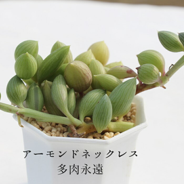 【 おすすめポイント♪ 】 アーモンドネックレスは、その名の通り アーモンドのような形状の葉が特徴の多肉植物です。 葉には縦縞が入り、季節によって色が変化します。 夏には鮮やかな緑色を楽しめ、紅葉期には茶色に色づく様子が まさにアーモンドのようです。この植物は水を好むため、 他の多肉植物よりも多めに水を与えると良いでしょう。 ※注意事項 セネシオ属は葉が落ちやすい品種です。 梱包、配送面に十分注意しお届けさせていただきますが、 葉が落ちてしまっていたら葉ざしにご活用くださいませ。 【 商品詳細 】 ■サイズ 5.5cmポット 白い植物の性質上、葉が茶色く変色する 時期がございます。 病気ではなく一年のサイクルですのでご安心下さい。 ■お届け ポット苗または抜き苗でのお届けです ■植物の名前 付箋にてお渡ししております ■同一梱包目安 60サイズ2寸5.5cmポット約12個まで同梱可能です 背丈のある植物が入る場合は8個〜9個目安です ■植物に関して 画像は見本となります。 植物ですので四季折々の変化を魅せます。 紅葉は人間が進められるものではありません。 薄れた色合いの場合は日々移り行く紅葉を お楽しみいただけますと幸いです。 注意事項を必ずご一読ください。 【 配送方法 】 4種郵便または宅配便 *日にち指定対応不可の商品です。 【 お世話カード 】 育て方が不安やプレゼントにしても安心なケアカード(別途100yen税抜)もございます 植物について・・・ Succulents はじめに 写真の多肉植物は見本です。お選びする多肉植物はご注文を頂いてから美しい植物を厳選し、配送させていただいております。植物ですので個体差はございます。植物苗は工場製品とは違い育成・成長に相当な年月を要します。 この為ある程度の傷等不具合はご了承願います。既製品ではなく日々生育していく植物です。 植物の形・姿にこだわりをお持ちのお客様は弊社栽培場での購入をお勧めいたします。 到着時、葉にみられる茶色いシミは鉄分によるものです。植物には支障はございませんのでご安心くださいませ。 水道水でお水を与えていれば自然と消えていきます。 また、用土内に混入されている白い粒々は薬です。害虫予防のための薬ですのでご安心くださいませ。 日にち指定について 多肉植物のご注文は日にち指定をお受けできません。予めご了承ください。 大きさについて 鉢の大きさを明記してございます。必ずご確認頂きます様お願いいたします。 ラッピングについて ギフト用に有料ラッピングをお受けしております 在庫について 自社サイトでの販売、栽培場での販売を共有しているため、 在庫切れの場合はやむをえずご注文をキャンセルさせていただく場合もございます 多肉永遠では自社栽培を行っております。一年を通し常に繁殖をしておりますが 十分な在庫を確保していても植物の為、天候に左右されたり、人気商品の大量買いの場合もあり、 急な欠品・在庫切れの状態に陥る場合もございます。 「在庫あり」でも欠品している場合もございます。予めご了承くださいませ。 納品書について エコ活動推進の為、納品書の発行をしておりません。ギフト用でもそのままご本人様にもお受け取り頂けます 商品が到着したら・・・ HOW TO CARE 置き場所 商品到着後すぐに開封してください。半日陰の場所へ置いてあげてくださいね。 春〜秋は太陽たっぷり当たる窓辺へ。夏は西日を避けたや東窓がお勧めです。 冬は太陽光が入る明るめの窓際がお勧めです。 西日が強い場所はなるべく避けてください。 水やり 到着後、3〜5日経ってからたっぷりと与えてください。根が落ち着き環境に慣れます。 配送の際に苗の崩れ予防でお水を与えている場合もございます。 お水は鉢の中が完全に乾いてからすぐに与えましょう。 紅葉時期 多肉植物の一番美しい時期は春と秋・冬です。春から秋は成長期になり仔を出して殖えます。 夏は遮光率を上げて半日蔭で過ごすため色味は緑色になります。 日々の管理 高温多湿を嫌うので通風良く促しましょう。 多肉植物は 屋内:一年中お楽しみいただけます 屋外:一年を通し戸外で楽しめます