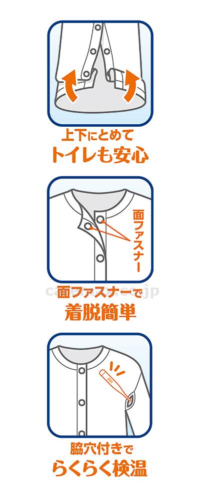 ウィズエール ワンタッチ肌着 半袖 婦人の仕様●サイズ(バスト)/M:79〜87cm、L:86〜94cm、LL:93〜101cm●素材/綿100%●生産国/中国●手洗い可●洗濯機可(40℃)●脱水機不可●乾燥機不可ウィズエール ワンタッチ肌着 半袖 婦人の説明・脇穴付きでらくらく検温!・介護・リハビリに使いやすい前開き肌着。・面ファスナーで着脱簡単!・綿100%の無蛍光素材を使用。・検温穴付き、トイレで裾を汚しにくい設計。