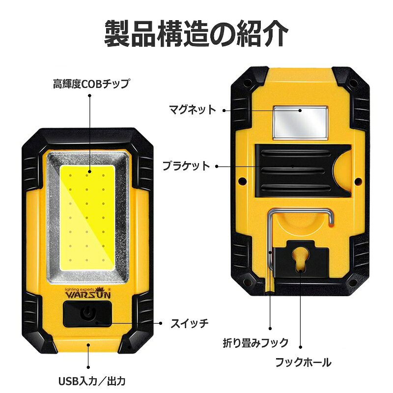 作業灯 led作業灯 投光器 ワークライト ハンディライト ランタン COBライト 高輝度 折り畳み式 防水 緊急用照明 停電用 自動車整備 釣り 夜間作業 夜釣り アウトドア キャンプ用 軽量 超小型 車載 自動車整備 釣り 夜間作業 軽量 超小型 車載 レビューで保証延長 弊社の製品ご覧いただき誠にありがとうございます。商品到着後3日以内、商品レビューを投稿されたお客様には最短半年最大2年間保証を付けさせていただきます。是非ご協力お願い申し上げます。 12時までの注文当日発送 1