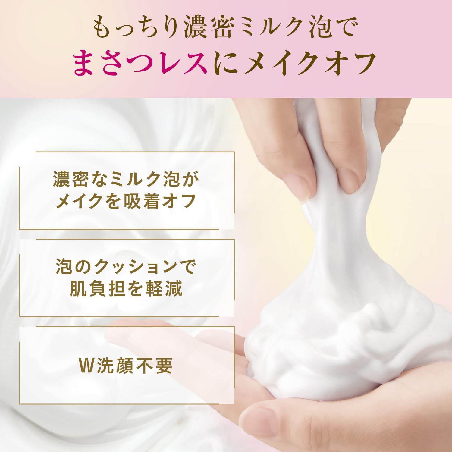 商品説明■ 商品紹介まさつレスにやさしくメイク吸着落ち もっちりミルク泡のご褒美クレンジング ■贅沢なミルク泡でやさしくメイクオフ ミクロサイズの濃密なもっちり泡が肌に密着 泡のクッションになり、まさつレスにメイクを吸着オフ ■洗い上がりの肌がしっとりうるおう シアバター(*1)配合、うるおいに満ちた素肌へ導く ・W洗顔不要 ・まつエク(*2)OK ・ぬれた手・顔OK ・香料フリー、着色剤フリー、アルコールフリー(エタノール無添加)、パラベンフリー *1 シア脂(保湿成分) *2 一般的なグルー(シアノアクリレート)対象■ 原材料・成分水、グリセリン、DPG、イソステアリン酸PEG-8グリセリル、ラウリン酸ポリグリセリル-10、イソブタン、PEG-32、PEG-6、PEG-6(カプリル酸/カプリン酸)グリセリズ、ソルビトール、カプリル酸ポリグリセリル-3、シア脂、二酸化炭素、チューベロースエキス、ラベンダー油、ローズマリー葉油、エンピツビャクシン油、ニオイテンジクアオイ油、ジプテリクスオドラタ豆エキス、ラウラミドプロピルベタイン、ラウレス硫酸Na、ミリスチルアルコール、PEG-90M、ステアリン酸PEG-150、ラウラミドプロピルヒドロキシスルタイン、コカミドメチルMEA、ラウリルグルコシド、PEG-50水添ヒマシ油、カプリリルグリコール、クエン酸トリエチル、フェノキシエタノール■ 使用方法○ご使用前にノズル部分のストッパーをはずしてください ○手のひらに適量(レモン1個分)を取り、顔全体に泡を広げてください ○泡の上から顔を包み込むように手を添え、泡をクッションにしながらやさしくメイクとなじませ、その後十分にすすいでください ○ウォータープルーフマスカラは落ちにくい場合があります。その場合は目元用のリムーバーのご使用をおすすめします ■ 安全警告●お肌に異常が生じていないかよく注意して使用してください ●傷や湿疹等異常のあるときは使わないでください ●刺激・色抜け(白斑等)・黒ずみ等の異常が出たら使用を中止し皮フ科医へご相談ください ●目を閉じて目に入らないように注意し、入ったときや異常(かすみ等)を感じたときはすぐに洗い流してください ●直射日光や高温・低温になるところには置かないでください ●浴室乾燥時の浴室内には置かないでください ●泡に含まれるガスにより、ご使用中お肌にピリピリ等の刺激を感じることがあります。洗い流せばおさまりますが、お肌に合わないときはご使用をおやめください ●本品は合成香料フリーであり、ご使用中に感じられる香りは植物由来の保湿成分によるものです ●植物由来成分の性質により、においに変化が生じることがありますが、品質には問題ありません ●子供の手の届かないところに置いてください