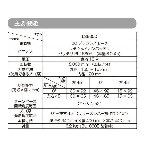マキタ 18V 165mm充電式卓上マルノコ 【本体+6.0Ahバッテリー+充電器】 注:本商品にチップソーは付属しておりません。 商品名:LS600DRG 定価: 105,400円+税 《標準付属品》 (1)本体 (2)6.0Ahバッテリー Bl1860B 1本 (3)充電器 DC18RF (4)ダストバッグ (5)三角定規 (6)立てバイス (7)ボックスレンチ (8)六角レンチ ★ご購入の際のお願い★ ********************* *(1)木曜日の午後12:00以降、 * * 金〜日曜日のご注文分は、出荷が * * 翌週の月〜火曜日の出荷になる場 * * 合があります。 * * 出荷日は、受注日+1〜3営業日内* * * * 【休業日:土・日・祝日】 * * * *(2)商品仕様明細は、商品画像の中の * * 《仕様表》も併せて参照して下さい* *(3)弊社の会社概要とお買い物ガイド * * を必ずご一読ください。 * *********************