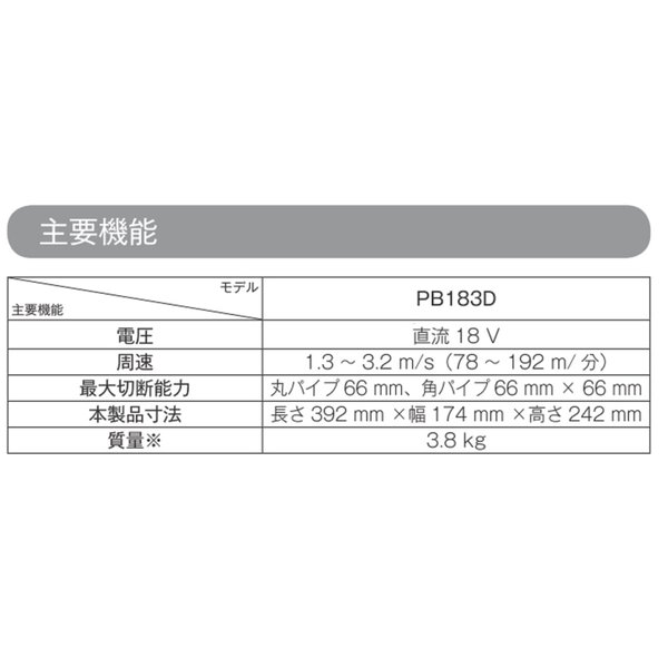 マキタ 18V充電式バンドソー 商品名: PB183DRGX 切断可能厚さ: 66mm 《商品構成》 (1) 本体 1台 (2) 6.0Aバッテリ 2本 (3) 充電器 1台 (4) ケース ★ご購入の際のお願い★ ********************* *(1)木曜日の午後12:00以降、 * * 金〜日曜日のご注文分は、出荷が * * 翌週の月〜火曜日の出荷になる場 * * 合があります。 * * 出荷日は、受注日+1〜3営業日内* * * * 【休業日:土・日・祝日】 * * * *(2)商品仕様明細は、商品画像の中の * * 《仕様表》も併せて参照して下さい* *(3)弊社の会社概要とお買い物ガイド * * を必ずご一読ください。 * *********************