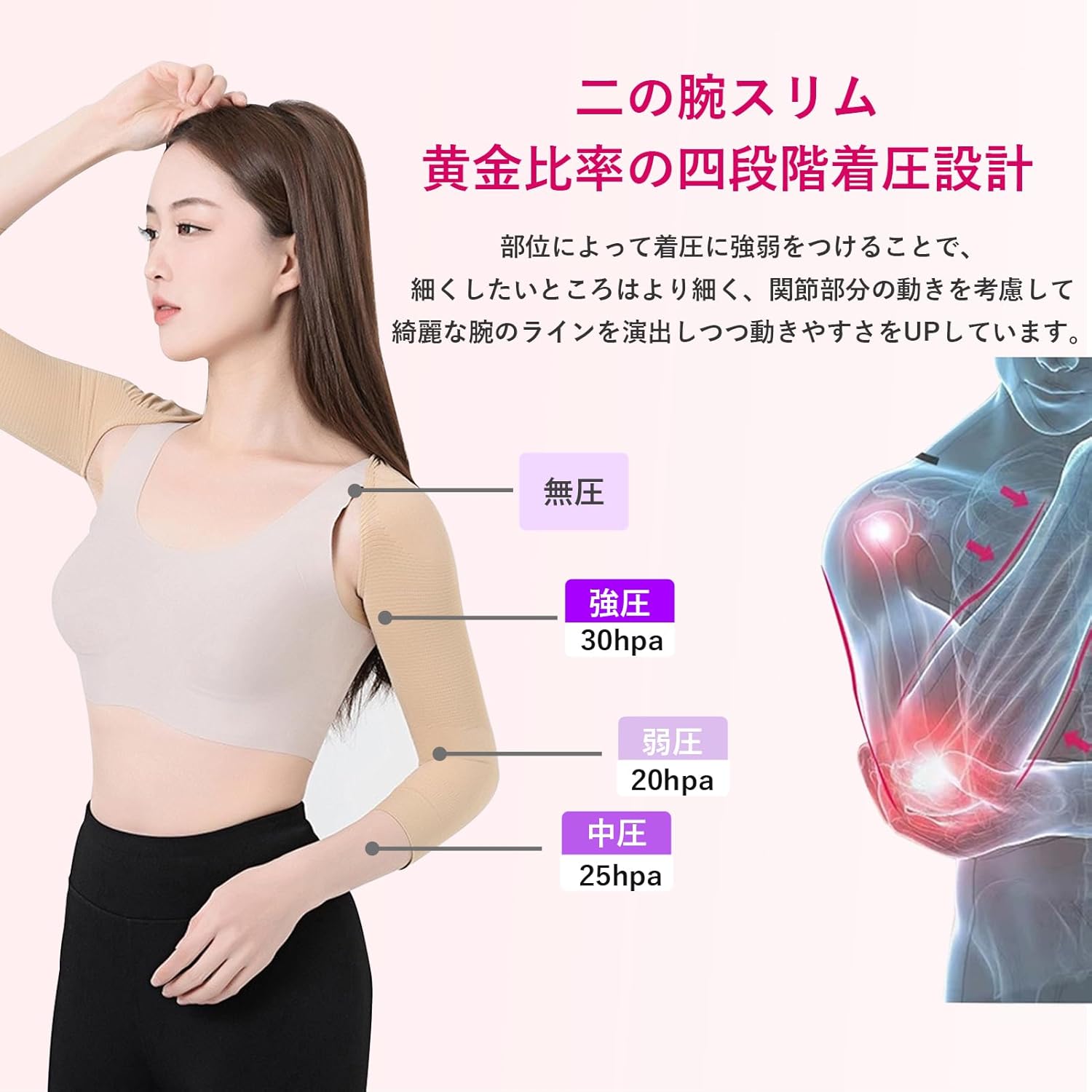 商品説明 商品紹介 【360度強力着圧+四段階着圧】 着圧にこだわって作られた、0hPa〜30hPaまでの4段階着圧サポートで二の腕をスッキリ引き締めてくれる二の腕シェイパーです。肩まわりは無圧ゾーンになっているため、日常生活での動きが妨げられません。4段階に着圧を分け各部位ごとに適切な着圧がかかるよう設計されており、独自の編み機を使い製造した、段差のないなめらかな着圧で、細くしたいところはより細く、関節部分の動きを考慮して綺麗な腕のラインを演出しつつ動きやすさをUPしています。 【1枚3役】 これ一枚で姿勢矯正・巻き肩ケア・二の腕シェイプの三役。肩甲骨まわりの着圧に縦型ウェーブと横型ウェーブ両方を取り入れることで、より強力に姿勢サポートし肩甲骨が引き寄せされるので、二の腕用着圧シェイパーを着用することで、二の腕だけでなく肩周りや肩甲骨周囲なども一緒にサポートしてくれ、姿勢矯正や肩こりが気にならなくなったことも理想のボディライン実現が期待できます。二の腕が太いと悩んでいる人や猫背をケアをしたい方におすすめなです。 【凸凹構造+血行促進】 段階式に着圧を加えたり、凹凸ウェーブ加工されている素材を使用することで、着ているだけで筋肉に刺激が与えられ、動くたびに二の腕のリンパを刺激することで血流や老廃物が流れ、むくみがケアできる効果が期待できます。密着性を高める立体裁断を採用しており、着るだけで二の腕が引き締まります。 【紫外線対策+薄型設計】 メッシュ編みで通気性がよいので蒸れなく、UVカット機能付きなど紫外線対策も兼ねるロングタイプなので暑い季節もさらっと着用できます。伸縮性と耐久性にに優れた生地で、1日中快適に着用できる二の腕シェイパーです。薄型設計なので、トップスの下に来ても着用が目立ちにくいです。24時間どこにいてもシェイプができます。 【色々なシーンで活躍】 着脱が簡単で、体系変化の大きい産後や術後の体型補正用としても、使いやすく設計されています。着用したままの運動も可能で、未着用時で比べると消費カロリーがアップし発汗を促進するため、リフレッシュ効果が高まります。仕事、家事中などどんな時にでも着用できます。ジムに通う時間の余裕がない方やテレワークで運動しなくなった方に人気です。 ご注意 ※製品の仕様は予告なく変更されることがあります。 ※こちらは海外輸入品になります。 ※改造/本来の目的以外/強い衝撃などはお控え下さい。 ※かなり細かく作業でしたが、神経質な方および完璧を求められる方はご購入をご遠慮下さい。 ※商品は、簡易包装で発送します。パッケージの場合、海外輸入品のため、外国語が表記されており、多少のスレ、汚れ、破れなどがある場合がございます。予めご了承ください。 ※パッケージは輸入国の言語が記載される場合がございます。 ※実際の色味と写真の色味は光の当たり方やディスプレイの環境によって、多少異なる場合がございますのでご了承くださいませ。 ※製品品質向上、または製造時期により、予告なくデザイン及び仕様を変更する場合がございます。 ※生産過程におきまして、若干のサイズ誤差、個体差が生じる場合がございます。 ※サイトに掲載されている商品は、撮影の照明、またパソコンなどの環境により、画像と実際の商品の色味が多少異なる場合がございます。 メーカー希望小売価格はメーカーサイトに基づいて掲載しています。 メーカー希望小売価格はメーカーサイトに基づいて掲載しています。 メーカー希望小売価格はメーカーサイトに基づいて掲載しています。