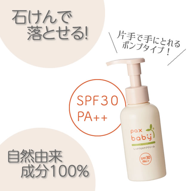 内容量90g成分水、プロパンジオール、スクワラン、酸化チタン、マカデミアナッツ油、グリセリン、ステアリン酸K、シリカ、ステアリン酸、パルミチン酸、ベヘン酸、ベヘニルアルコール、ローズマリー葉エキス、グリチルリチン酸2K、加水分解シルク、カミツレ花エキス、トコフェロール、ヒノキチオールご使用上の注意お肌に異常が生じていないかよく注意して使用してください。 使用中、または使用後の肌に直射日光が当たった際に赤み、はれ、かゆみ、刺激、色抜け(白斑等)や黒ずみ等の異常があらわれたときは使用を中止し、皮フ科専門医等にご相談されることをおすすめします。 傷やはれもの、湿疹等、異常のある部位にはお使いにならないでください。 取出し口は清潔に扱い、口に残ったクリームはふき取ってください。 極端な低温や高温を避け、日の当たらない涼しい場所に保管してください。 開封後は半年を目安にお使いください。使用しない期間が続くと硬さや状態が変化することがありますが、品質に問題はありません。 クリームが空気と触れない2重構造のボトルを使用しており、底面には外層と内層の間に空気を取り込むための細長い隙間がございます。 使用中、空押しになった際は再度ポンプを数回押してください。中身が少なくなるとポンプが上がりにくくなることがございます。ポンプを押す際にクリームが飛び出すことがございますのでご注意ください。 生産国日本発売元(株)太陽油脂SPF30 PA++ 自然由来成分100%紫外線吸収剤不使用で高SPFを実現。赤ちゃんの肌にも安心な成分で、夏本番の紫外線が強い季節もしっかり保護します。 赤ちゃんの皮脂にも含まれるパルミトオレイン酸を多く含むマカデミアナッツ油(角質保護成分を配合)配合で、お肌のうるおいケアもばっちりです。 ■SPF30、PA++ 陽射しが強いシーズンのお出かけに ■パルミトオレイン酸を多く含むマカデミアナッツ油を使用 ■無着色・無香料・アルコールフリー・石油由来成分不使用 ■100%自然由来原料使用(※) ■動き回る赤ちゃんにも手軽に使用できるポンプタイプ ■柔らかいテクスチャーで、赤ちゃんの体全体に塗りやすい ■敏感肌の方の大人の方にも ■石けんですっきり落とせる ■アレルギーテスト済み・パッチテスト済み(すべての方にアレルギーが起きないということではありません。) ※ISO16128-1に定義された自然原料、自然由来原料、鉱物由来原料のみを使用しており、同じく定義された非自然原料を使用していません。 使用方法少量ずつ手に取りムラなくのばしてください。 効果を保つために、汗をかいた後などは、その都度つけ直してください。 おでかけ前に「パックスベビー しっかりUVケアクリーム」でお肌を保護し、出先ではチューブ入りの「パックスベビー うるおいUVクリーム」で付けなおすという使い分けもおすすめです。