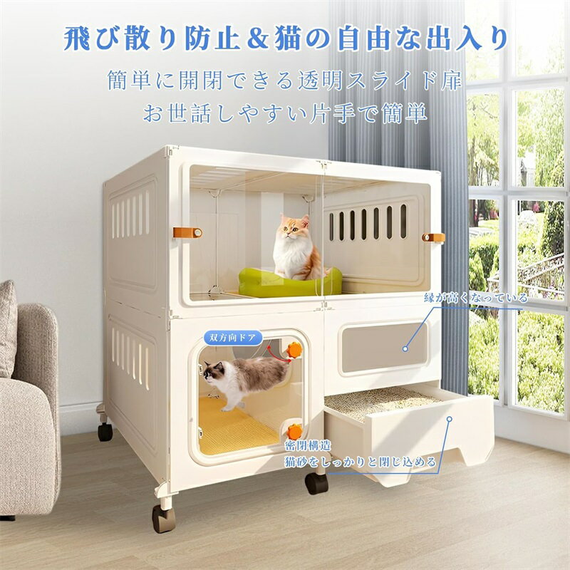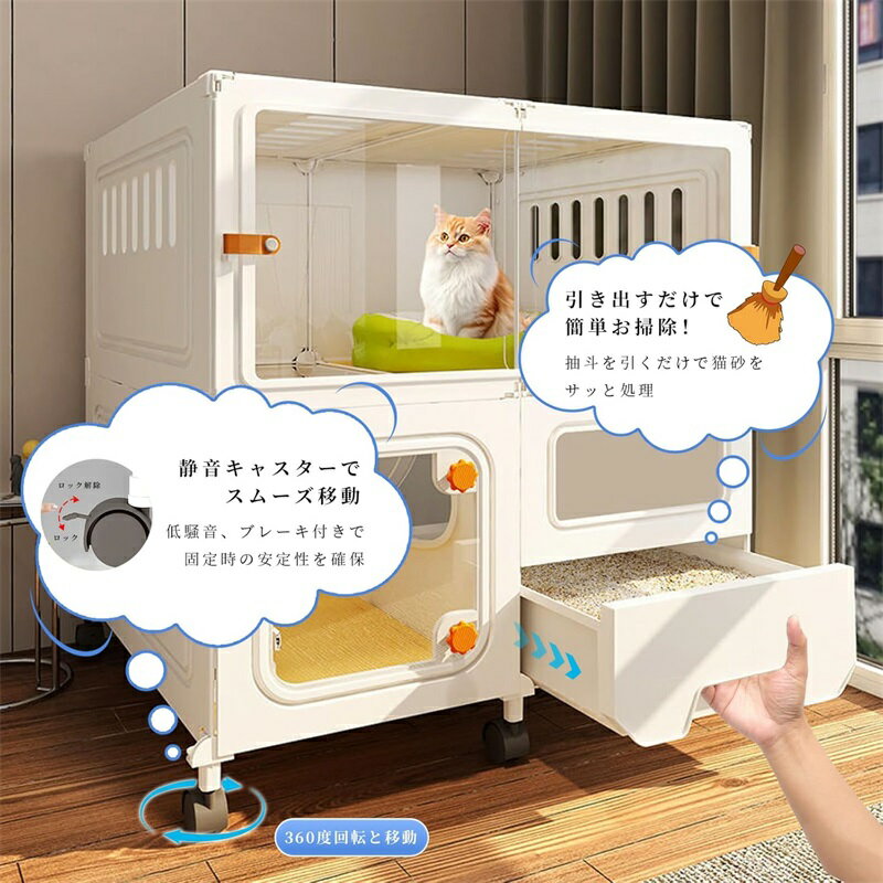 大型猫ケージ 室内用 キャスター 防滑付き トイレ専用ドア 組み立て簡単 多頭飼い対応 通気性 消臭 おしゃれ 猫用サークル
